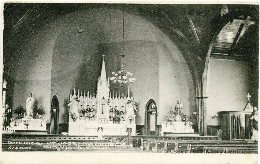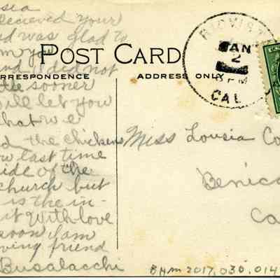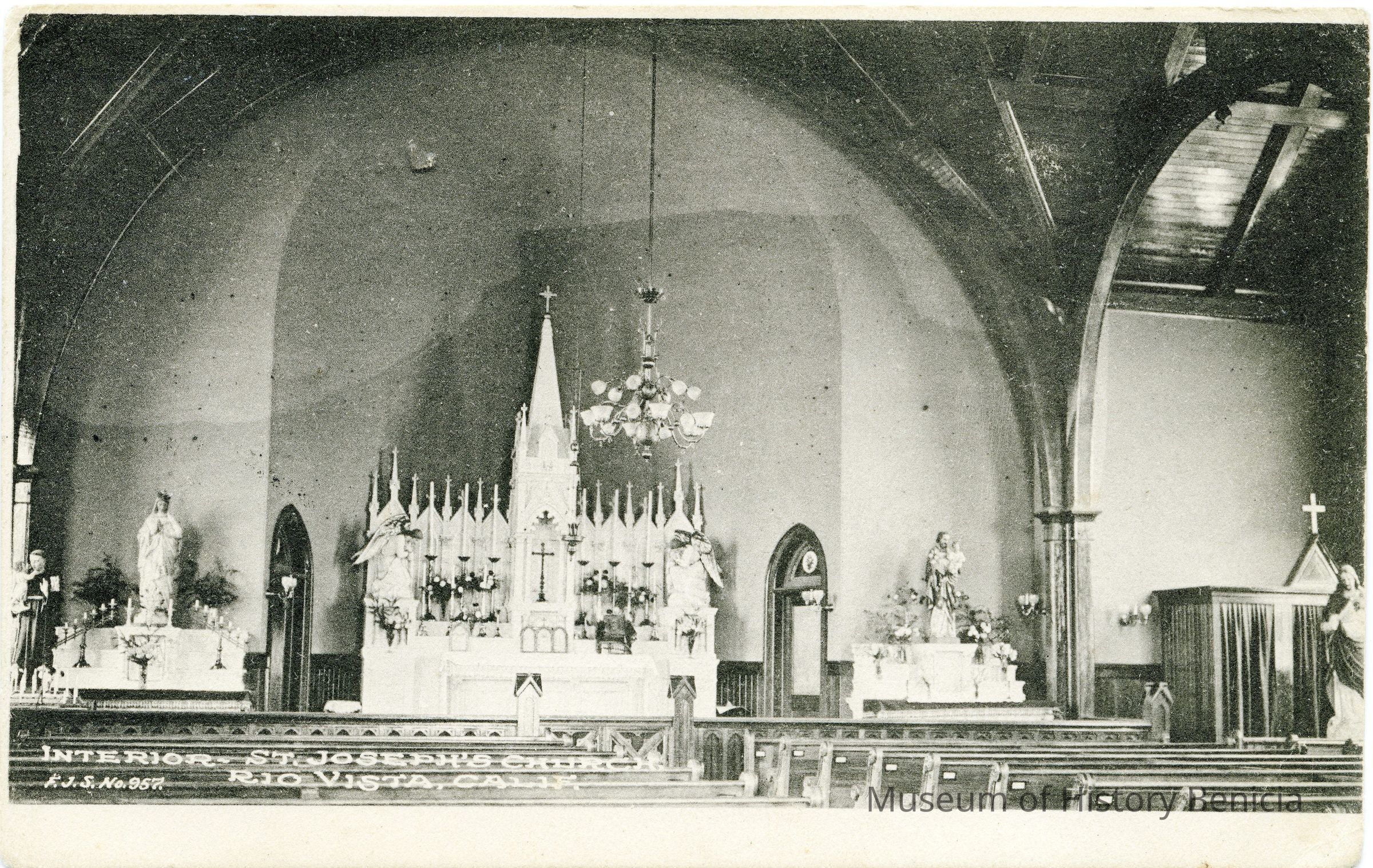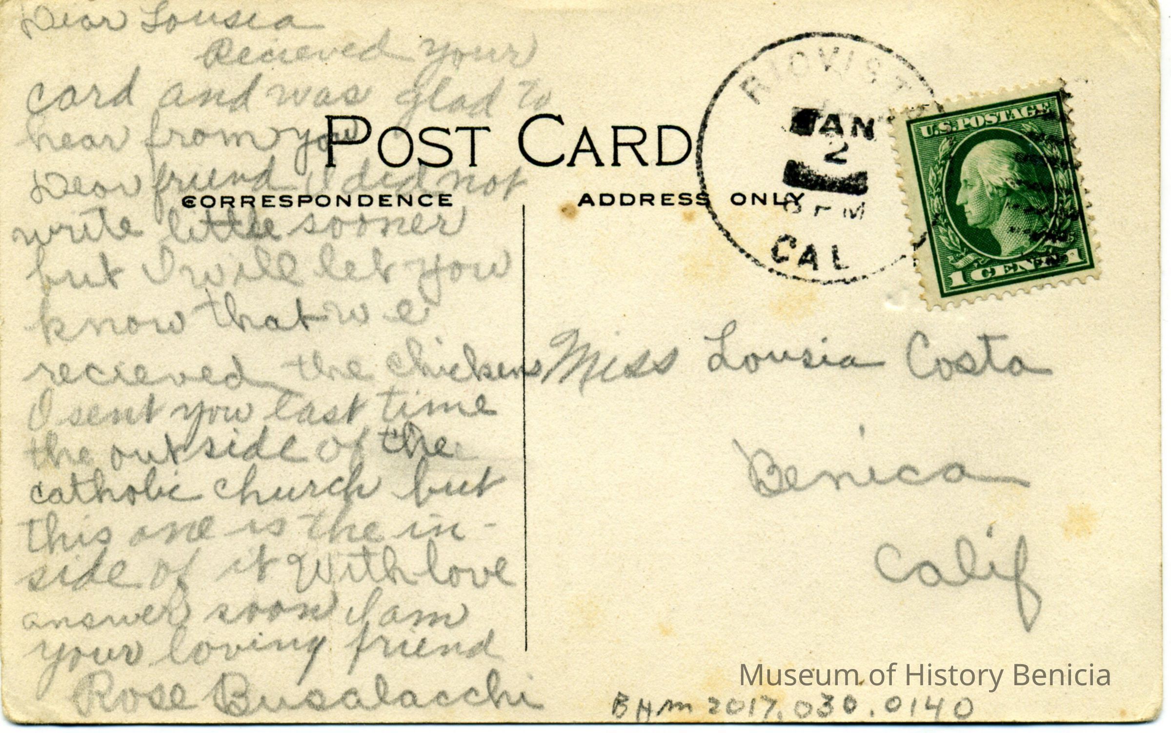 This is a divided back postcard. The photo is of St. Joseph's church in Rio Vista, CA. It was published by Frank J. Stumm of Benicia. The back is addressed to Miss Louisa Costa of Benicia ,CA. The message says that the writter received the chickens.Collection