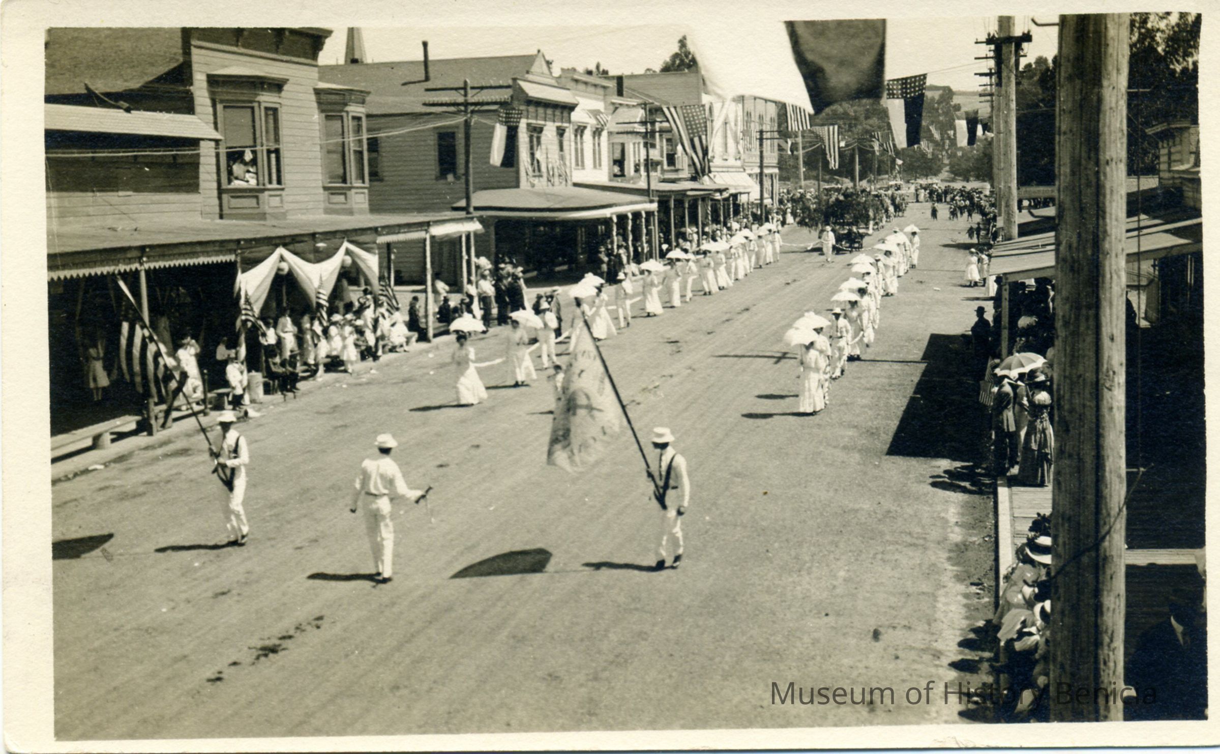 This is an unused postcard of a group of a parade in Benicia on First Street. A women's group is marching all in white with two flag bearers (men) in front and a director.