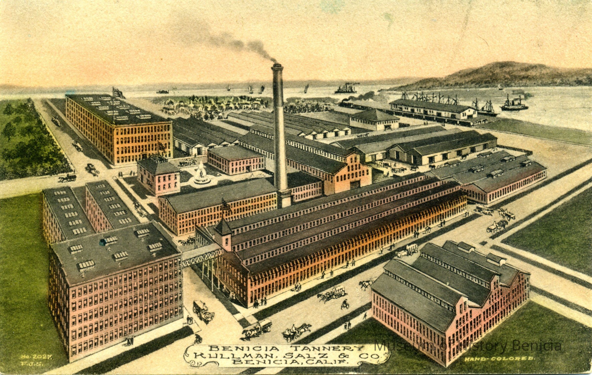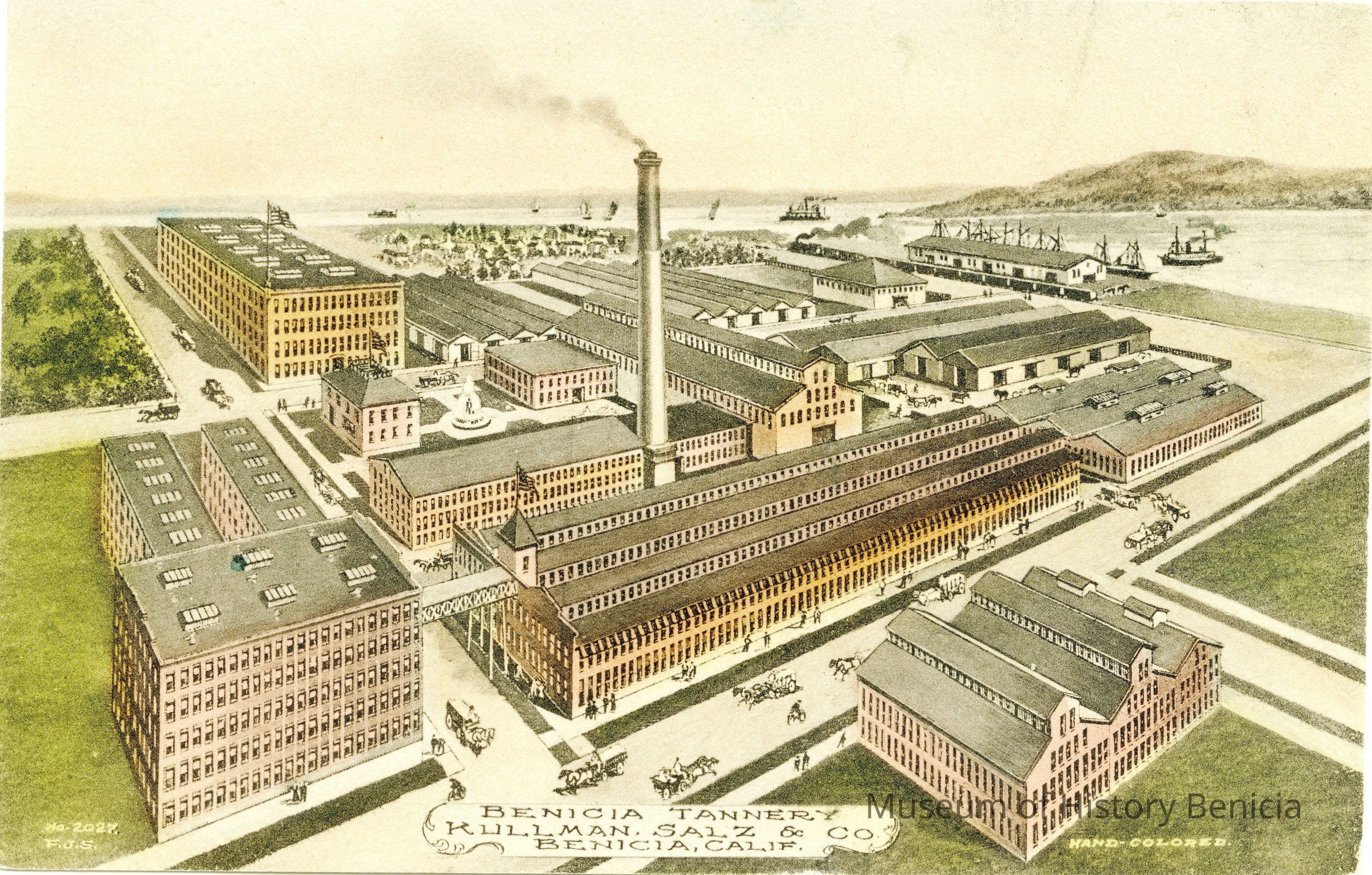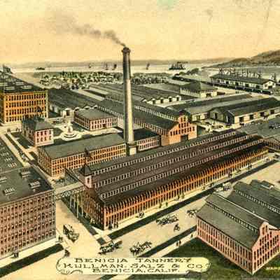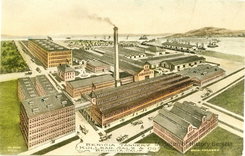 This is a colorized divided back postcard of Benicia Tannery owned by Kullman, Salz & Co. in Benicia, CA.. It is published by Frank J. Stumm of Benicia. The back is blank.Collection