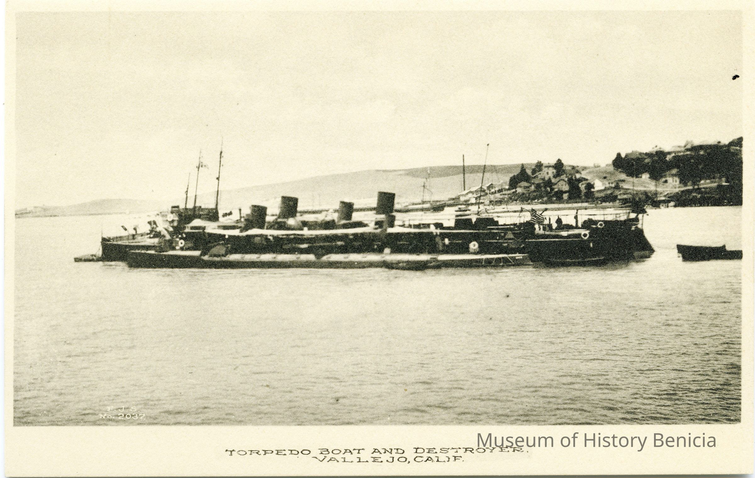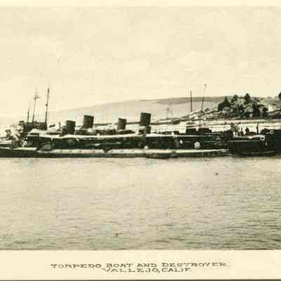 This is a divided back postcard. The photo is of a torpedo Boat and destroyer in Vallejo CA. It was published by Frank J. Stumm of Benicia. The back is blank.Collection