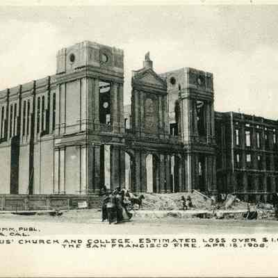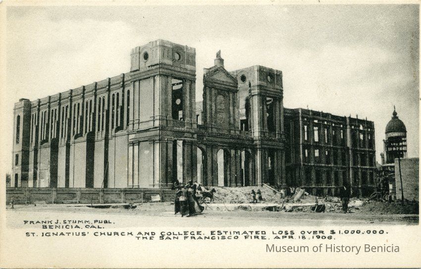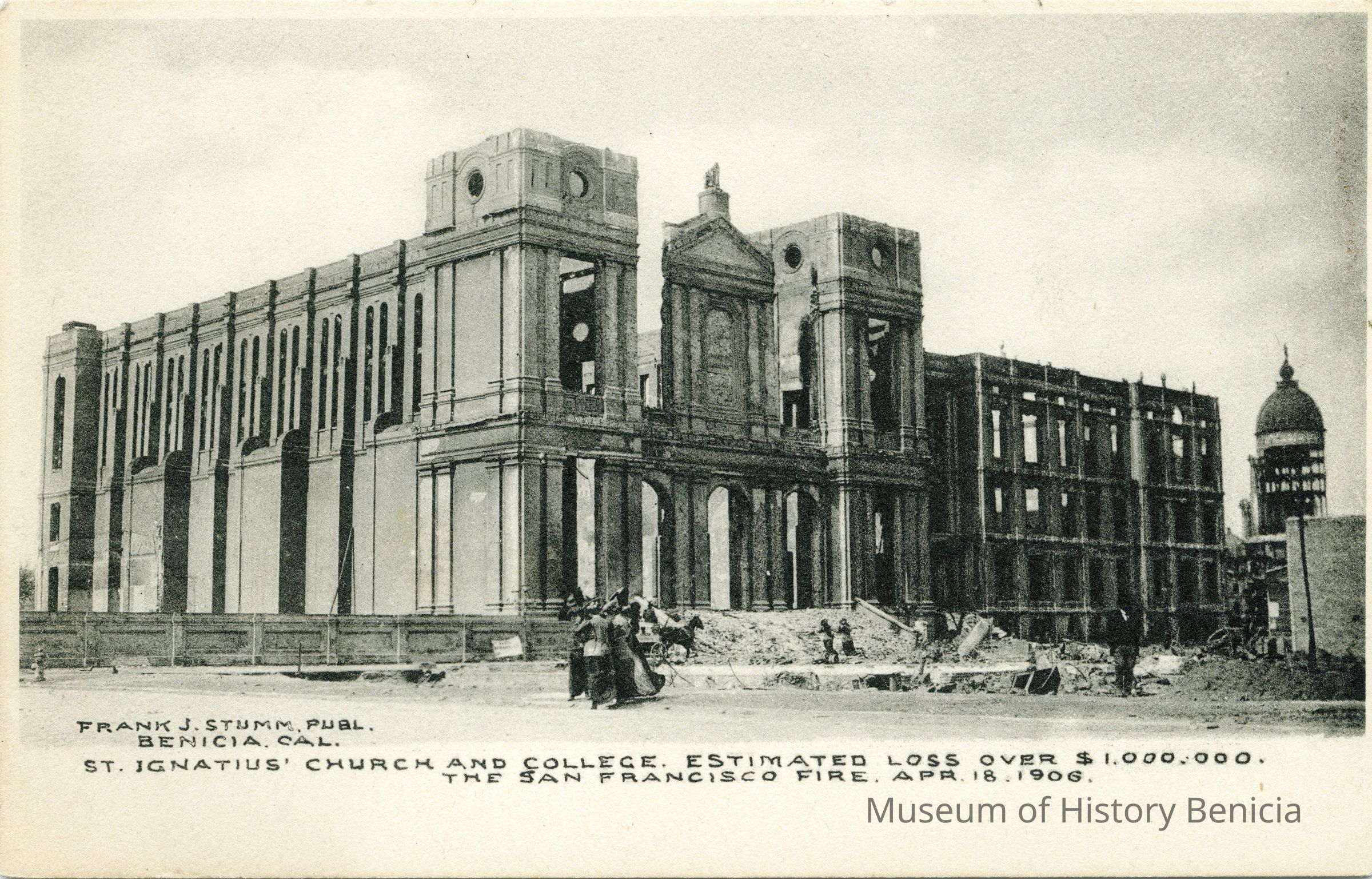 This is an undivided back postcard of St. Ignatius church and college in San Francisco after the 1906 earthquake and fire in San Francisco. It was published by Frank J Stumm from Benicia. The caption says there was over a $1,000,000 loss due to the fire.Collection