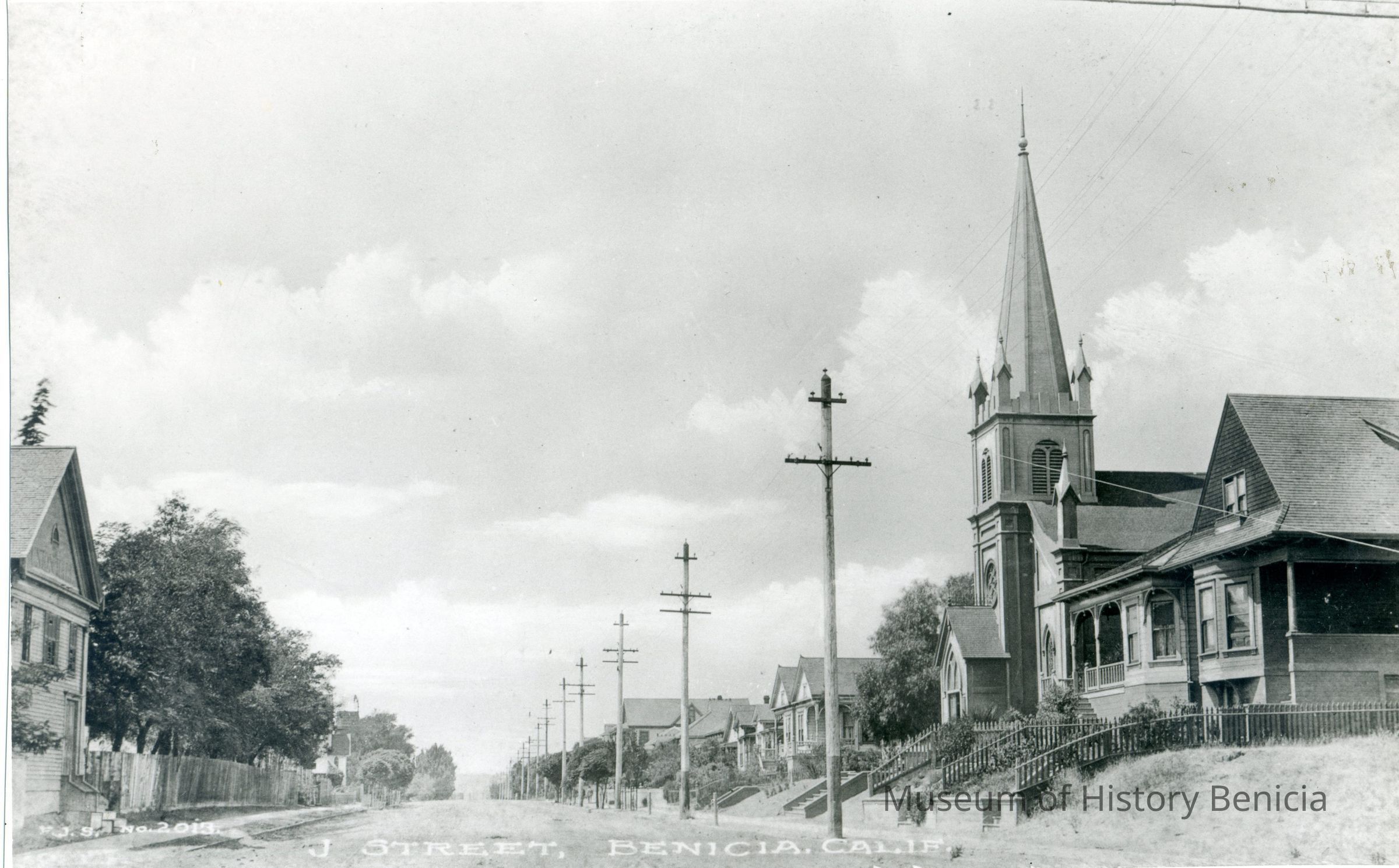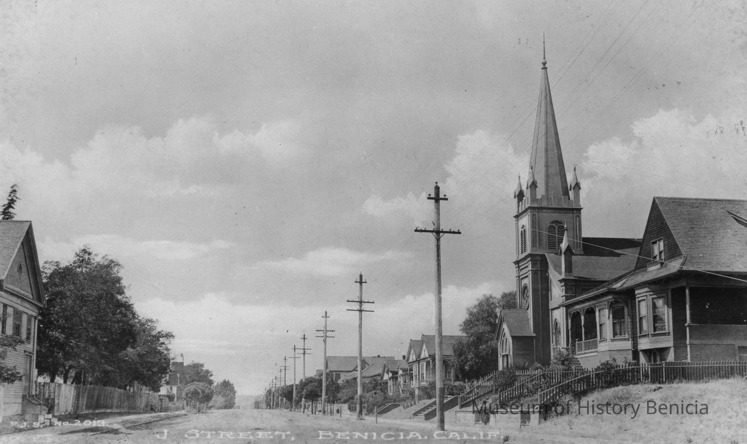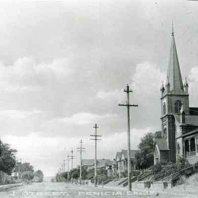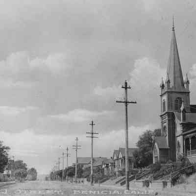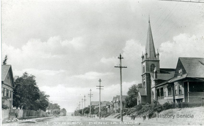B/W photo, appears as Figure 64 in Bruegmann's book; it shows West J Street in Benicia in the early 1900s, looking west from First Street. Masonic Temple at left.Collection
