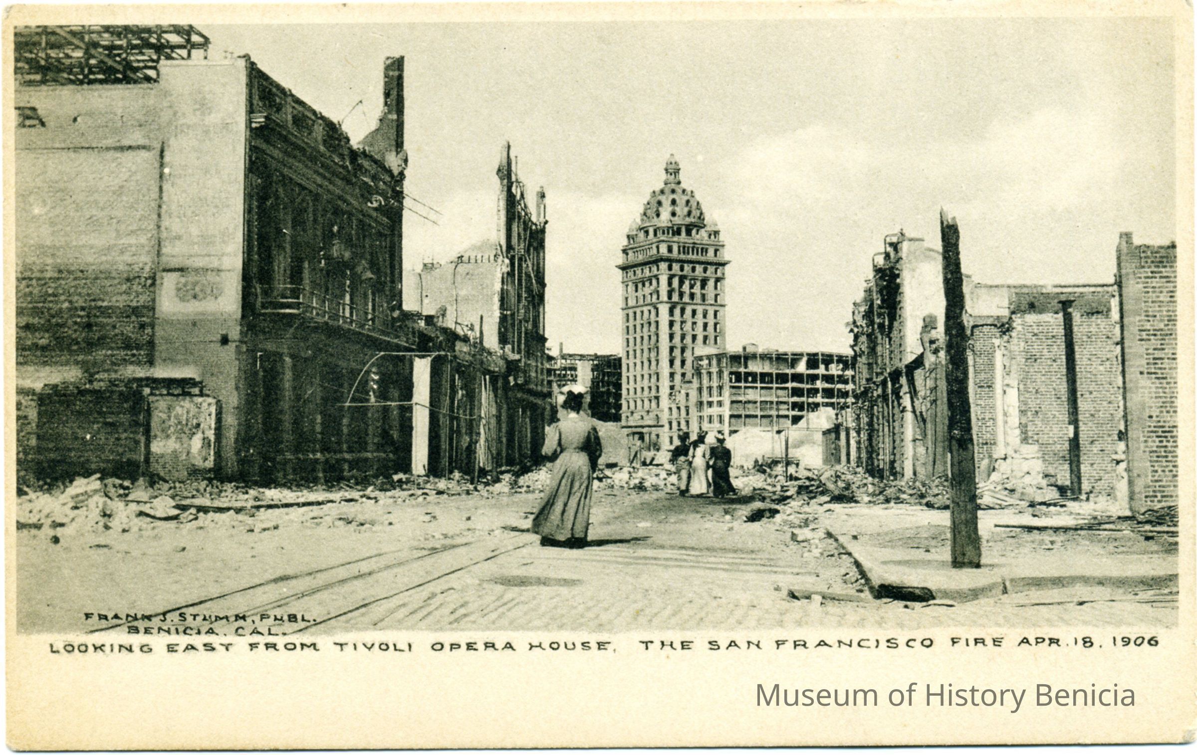 This is an undivided back postcard. The photo is of San Francisco after the 1908 earthquake. It shows the view East from Tivoli Opera House. The card was published by Frank J. Stumm. The back is blank.Collection
