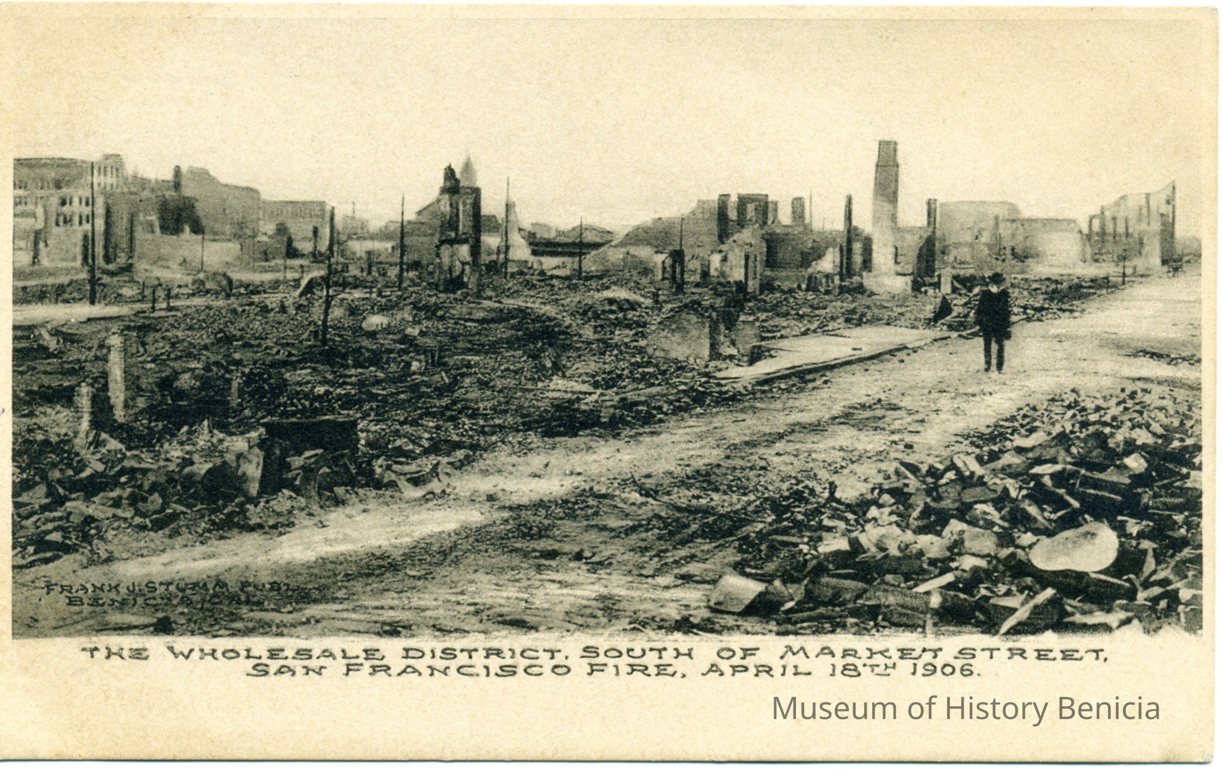 This is an undivided back postcard. The photo is of San Francisco after the 1908 earthquake. It shows the Wholesale District South of Market Street. The card was published by Frank J. Stumm. The back is blank.Collection