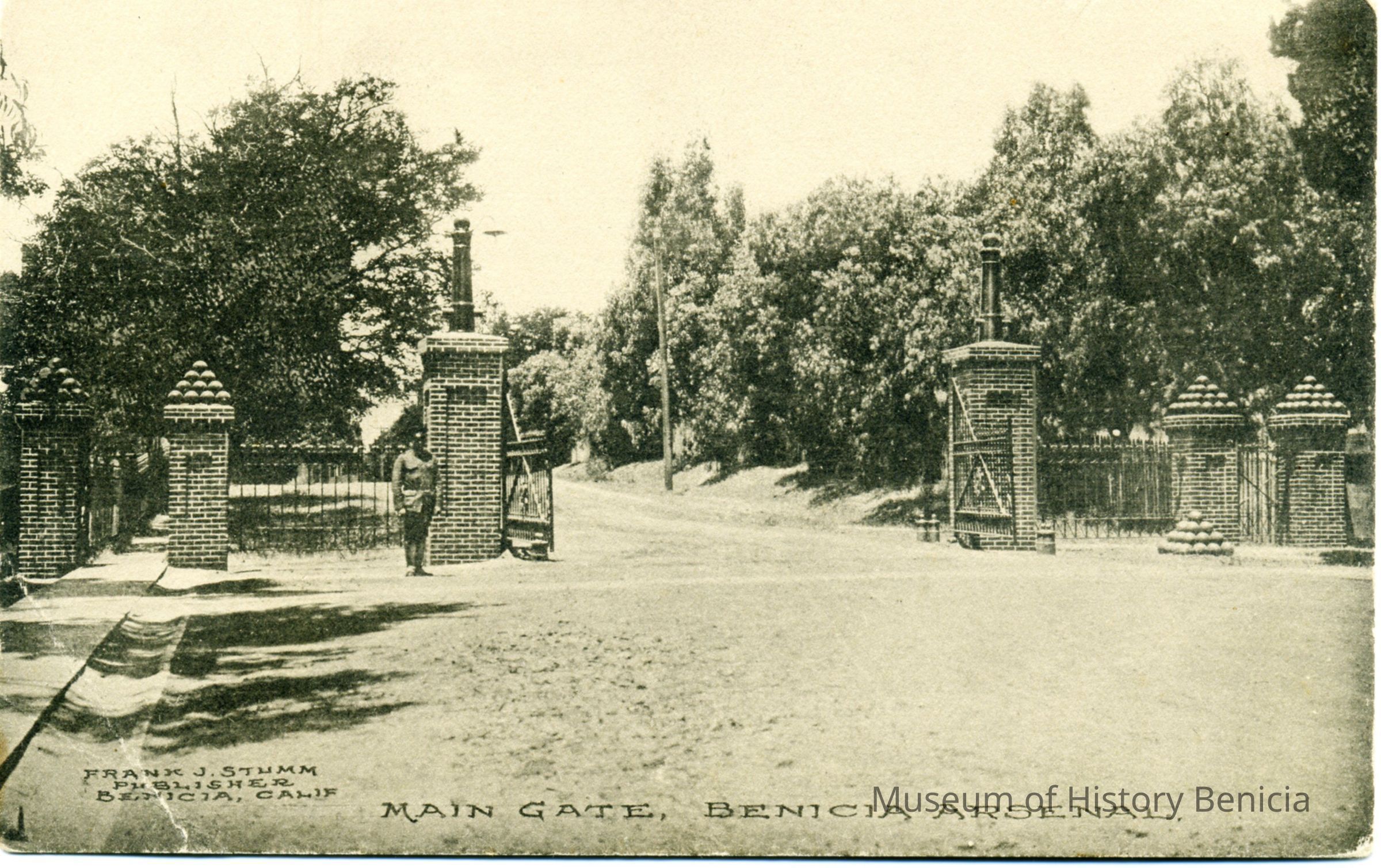 This is a divided back postcard. The photo is of the Main Gate to the Arsenal in Benicia. The back is blank. The card was published by Frank J. Stumm.Collection