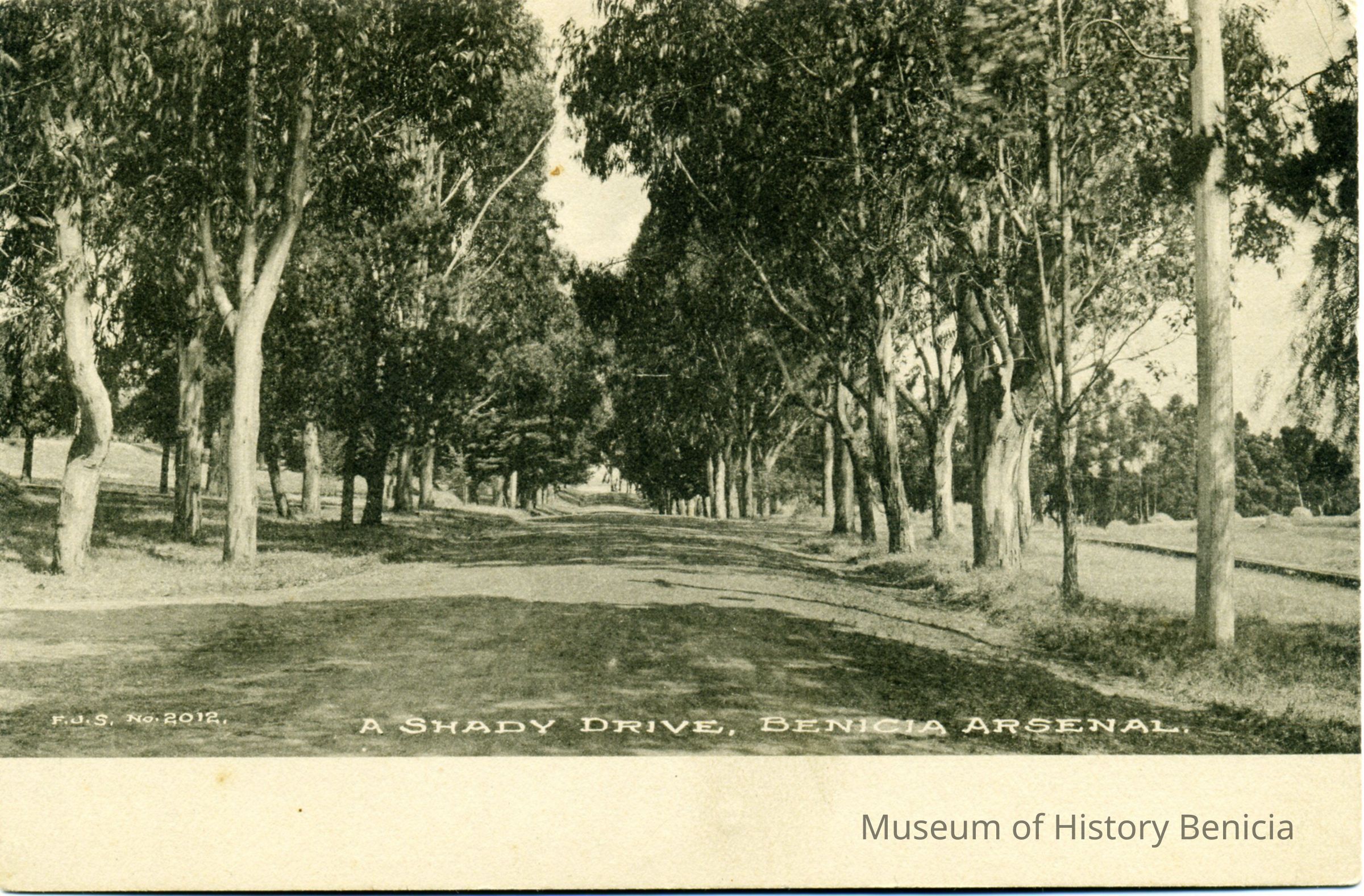 This is a divided back postcard. The photo is of a shady drive in Benicia. This looks like someplace in the Arsenal. The back is blank. The card was published by Frank J. Stumm.Collection