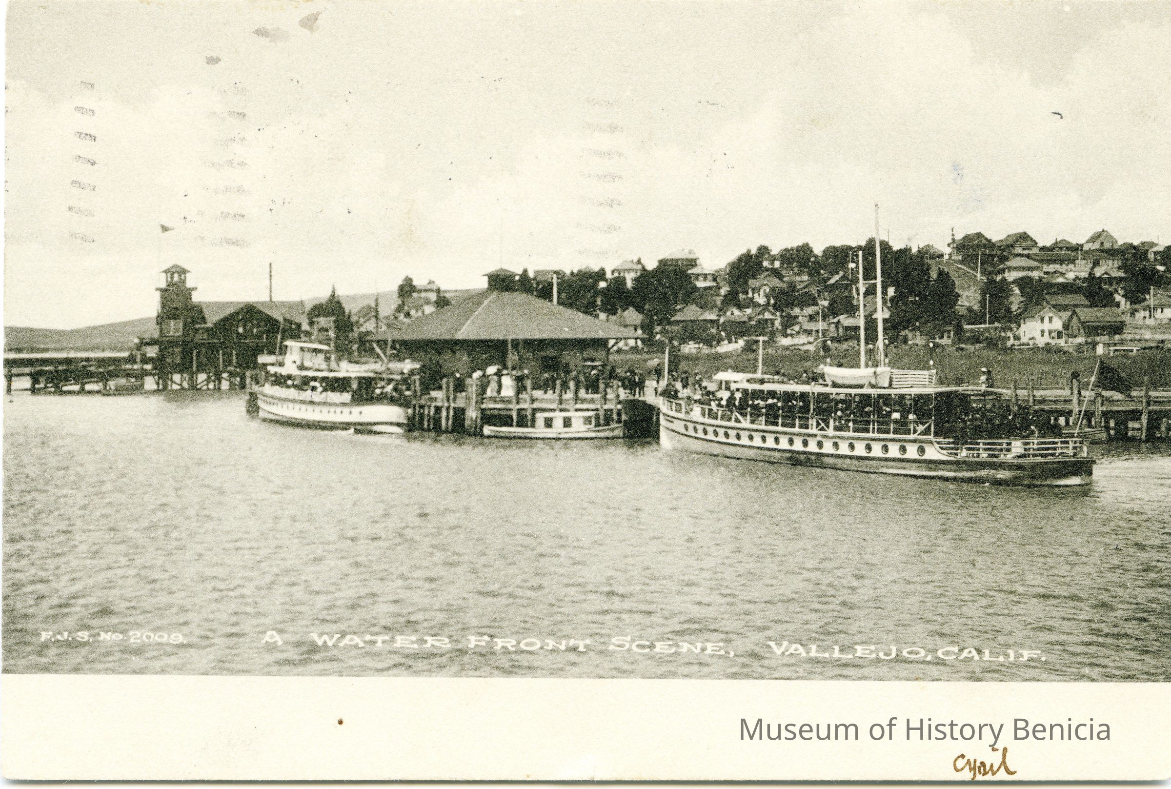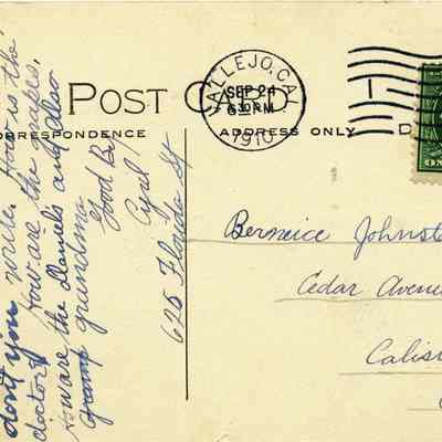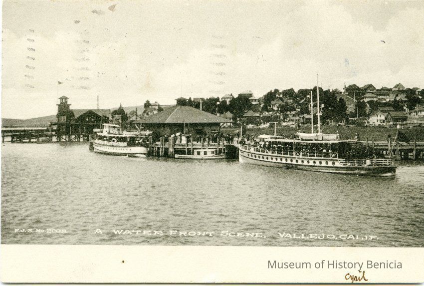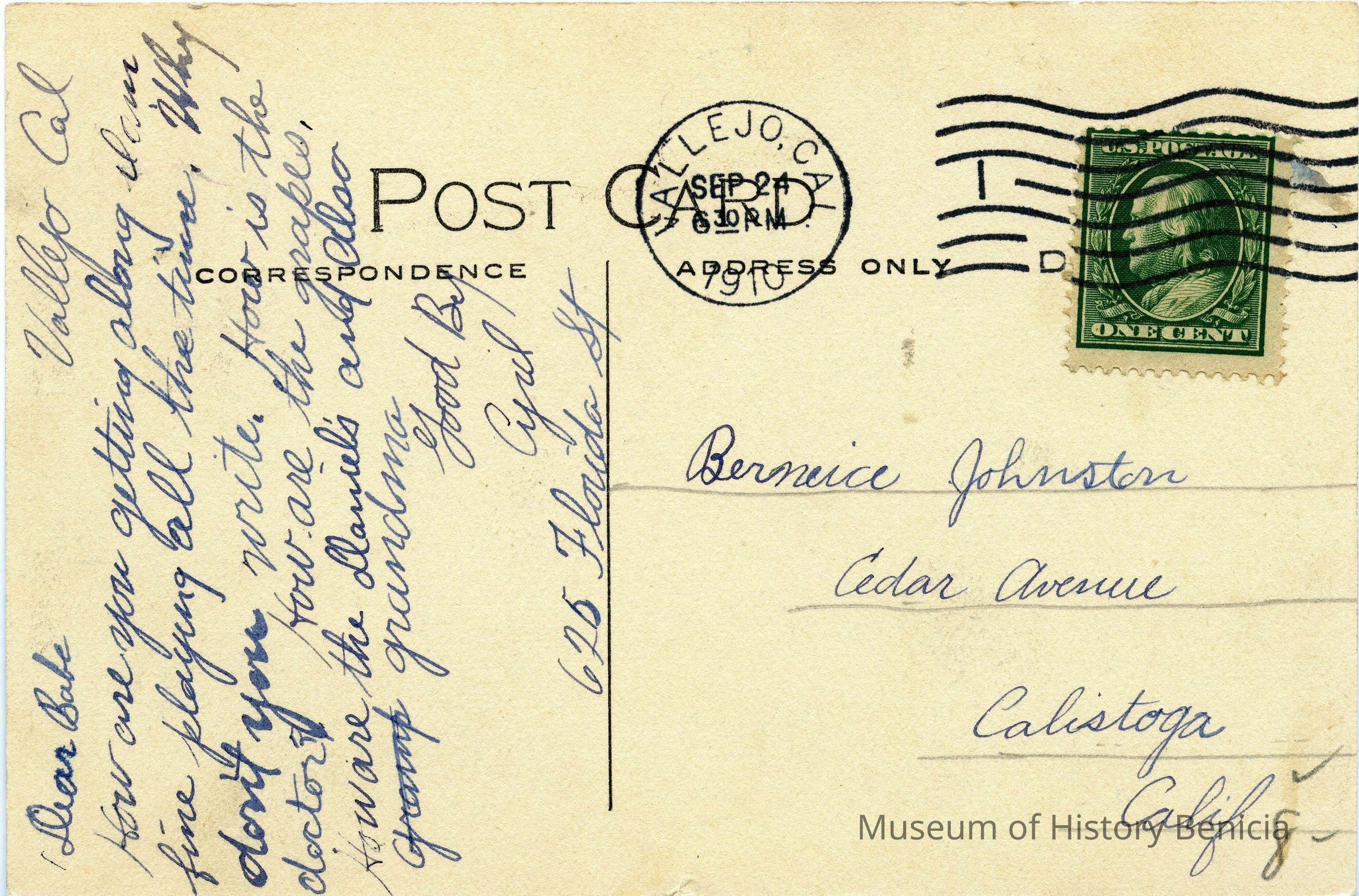 This is a divided back postcard of the waterfront in Vallejo, CA. The back is addressed to Bernice Johnston in Calistoga, CA. Cyril sent the card and is just asking how things are in Calistoga.Collection