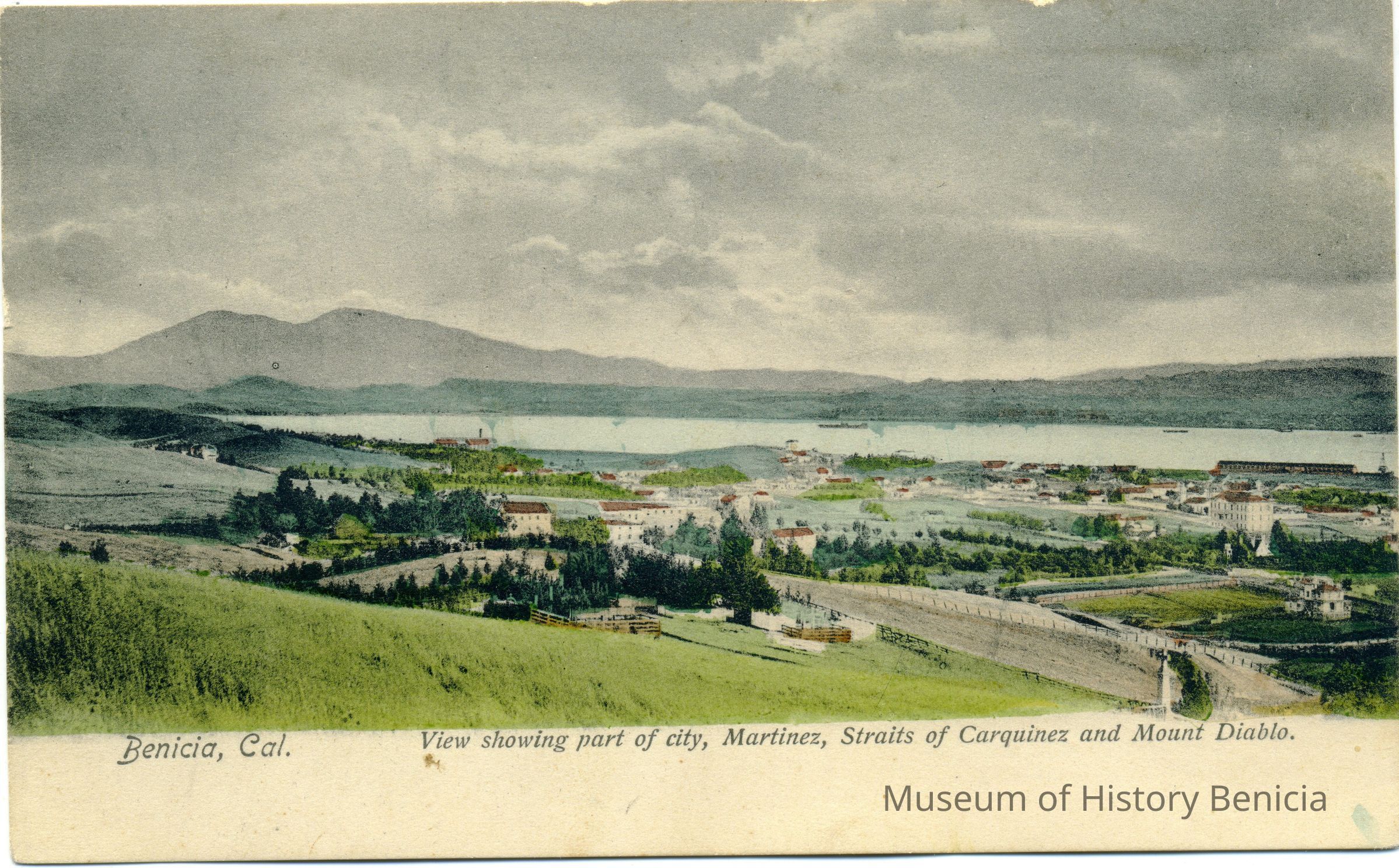 This is a real photo undivided back postcard of a view of Benicia and the Carquinez Straits. It is colorized and saya "View showing part of city, Martinez, Straits of Carquinez and Mount Diablo". The back is blank.Collection