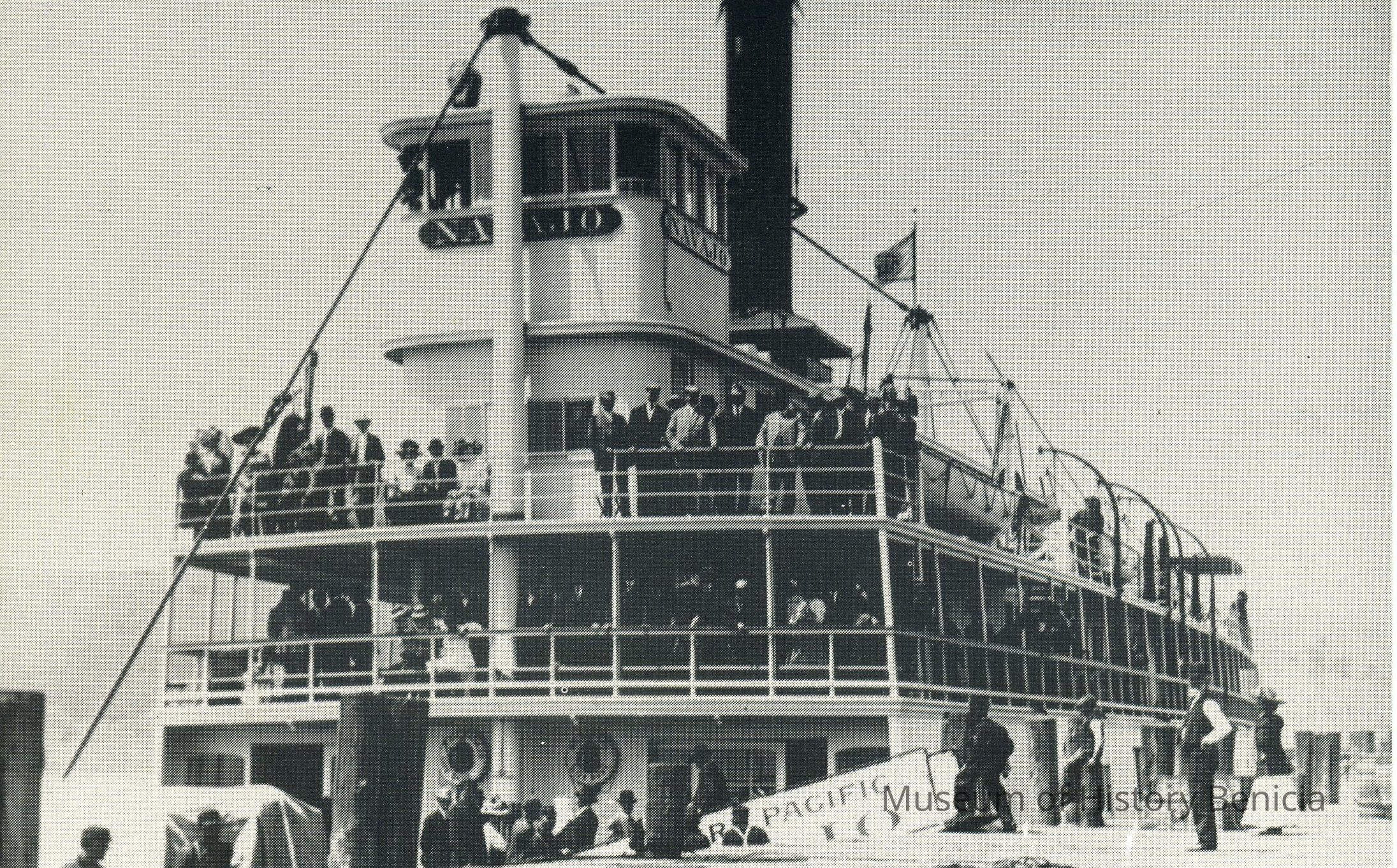 B/W Postcard Photograph - S.P. Navajo Stern-Wheeler. The "Floating Palace" was a Southern Pacific passenger ferry which transported riders from San Francisco to Sacramento. Built in 1909, the vessel is shown docked in Benicia during its prime.