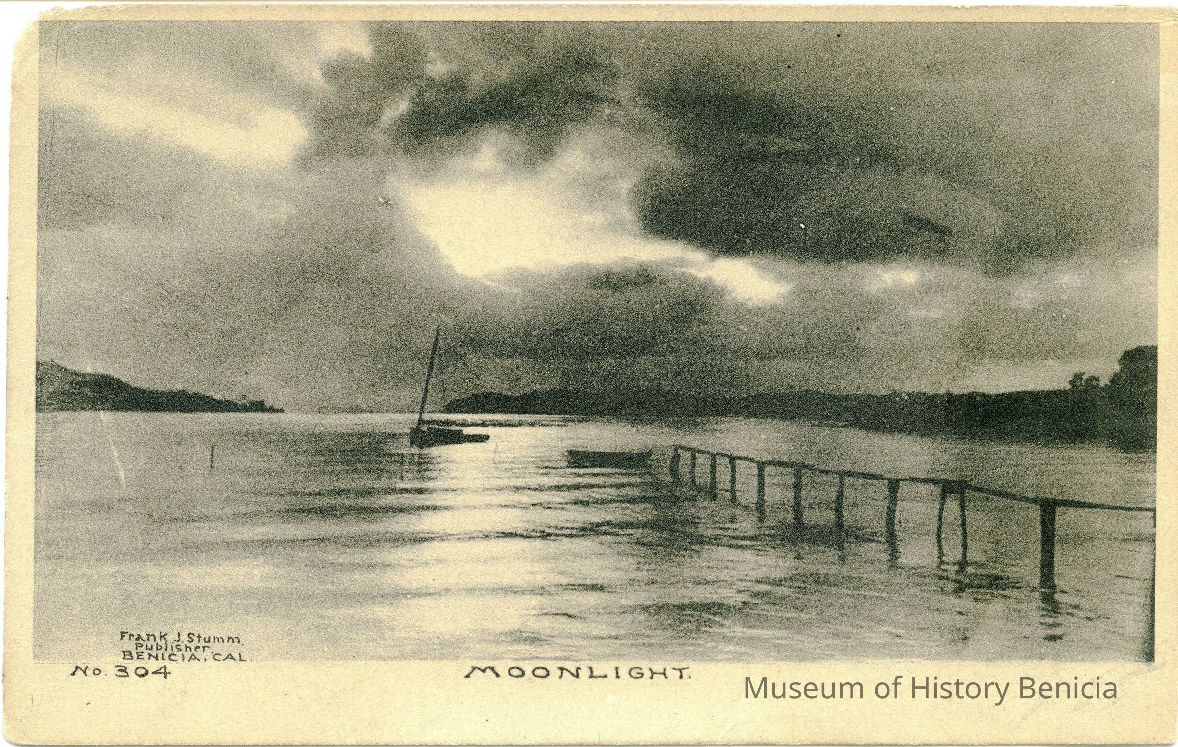 This is an address only back postcard of the Carquinez Straits at sunset. It is black and white and was published by Frank J. Stumm Publisher Benicia, Cal No. 304. The caption is "Moonlight". The back is blank.
