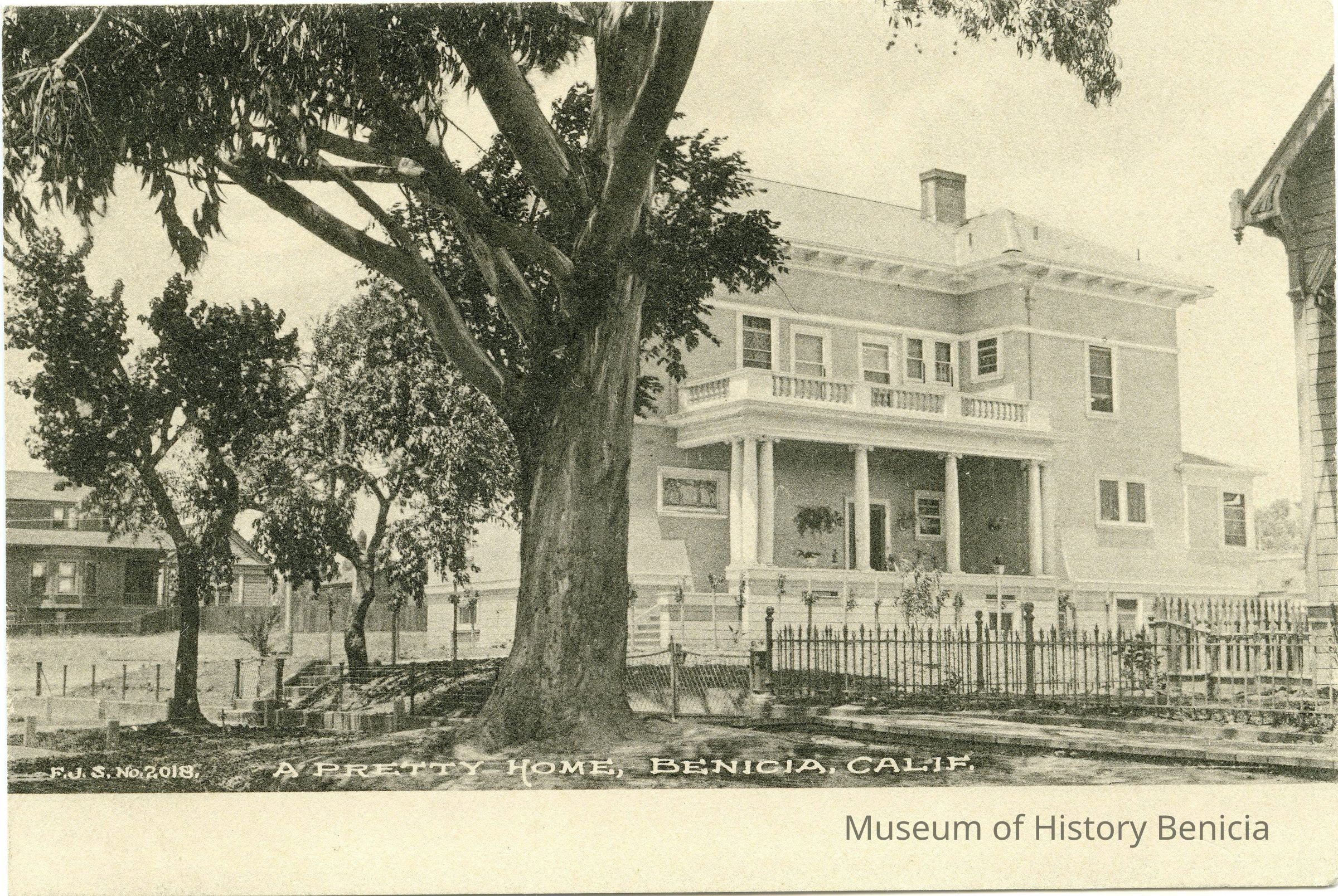 This is a divided back postcard of a house in Benicia Cal. It is black & white and was published by F.J.S. (Frank J. Stumm) No 2018. There is a photo on the front of a two story house with a colunade front porch. The back is blank.