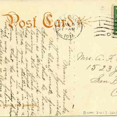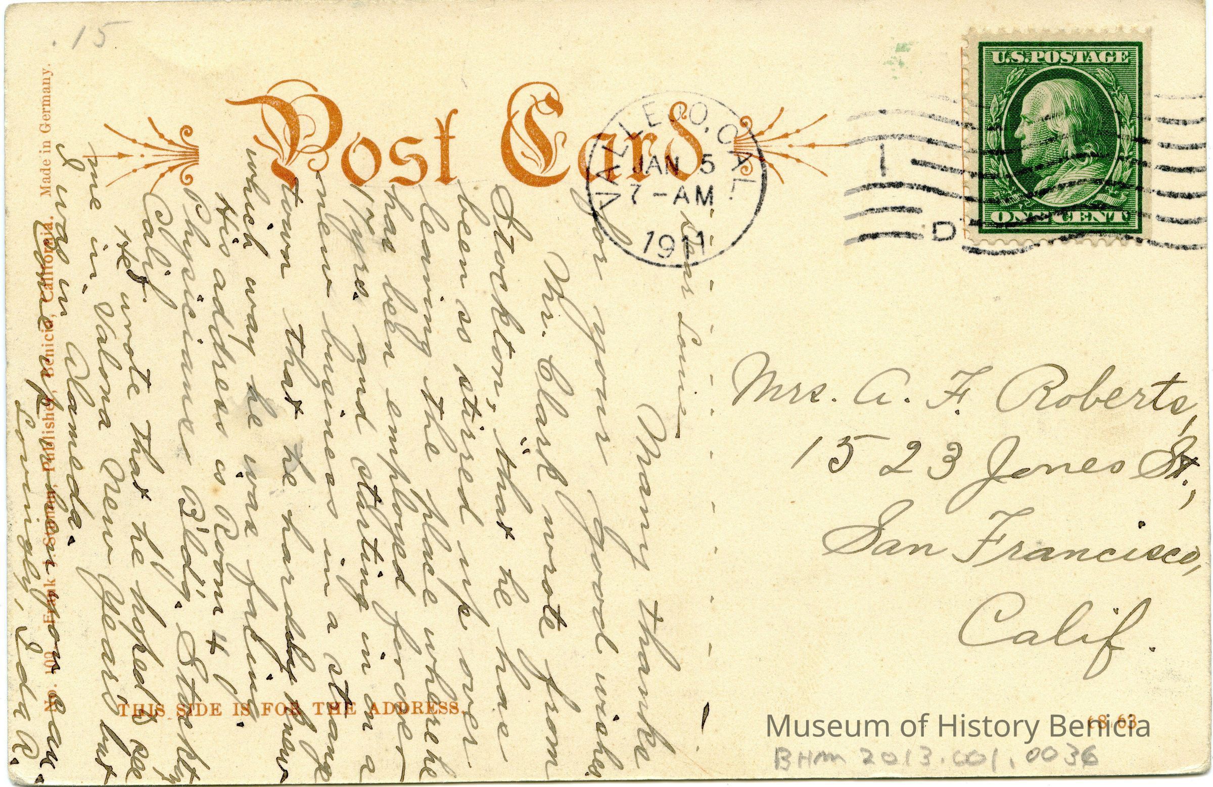 The card is addressed to Mrs. A.F. Roberts of San Francisco, CA and is from Ida A. The card talks of a Mr. Clark who left his place of employment after 17 years and is starting over in Stockton.Collection