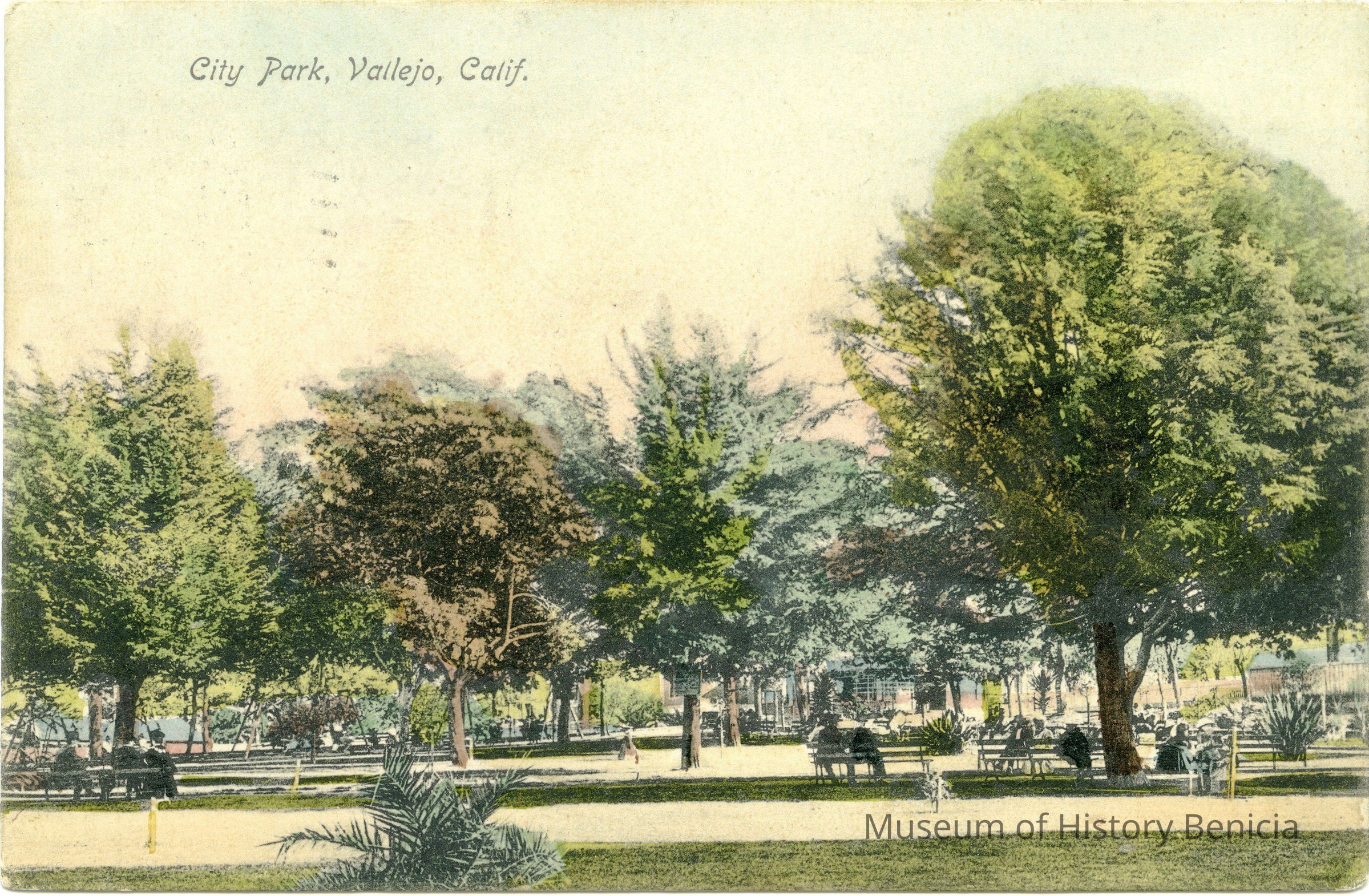 This is a address only back postcard which was written on as if it was a divided back postcard. It is of the City Park in Vallejo, Calif. It is colored and was published by Frank J. Stumm Publisher Benicia, Cal No 109. There is a photo on the front of the park.
