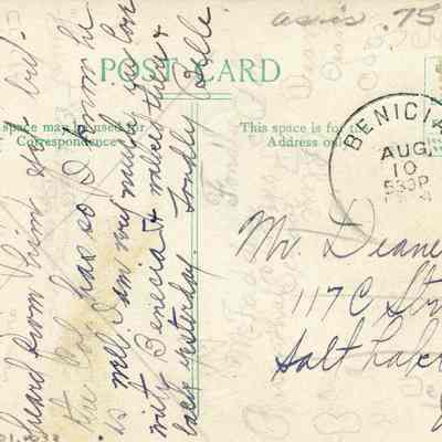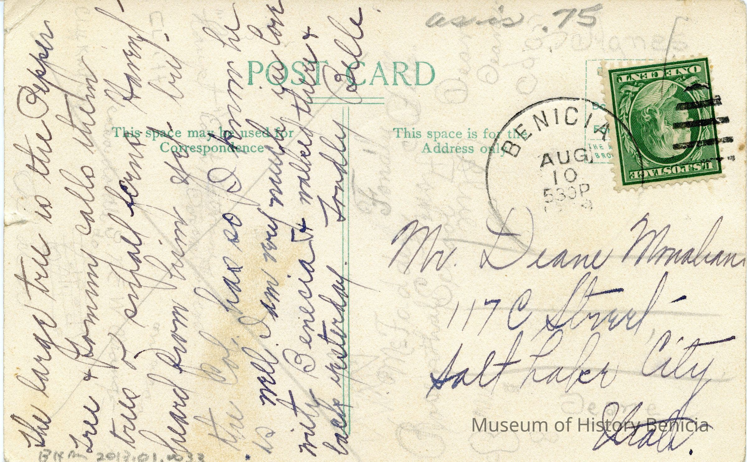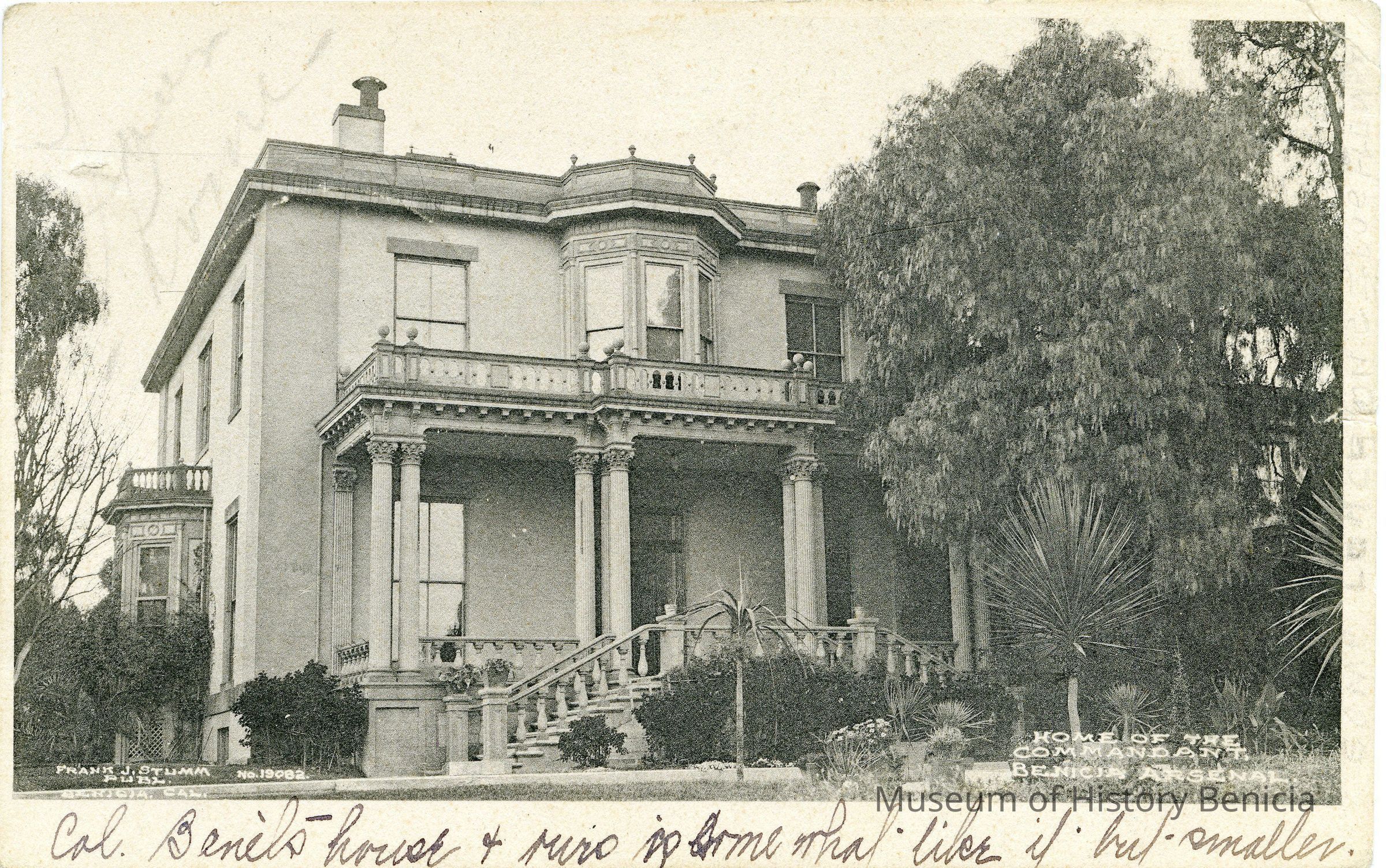 This is a divided back postcard of the Commandants Home in Benicia Cal. It is black & white and was published by Frank J. Stumm Publisher Benicia, Cal No 19082. There is a photo on the front of the Commandants Home at the Benicia Arsenal. Written on the front is "Col. Benets house & ours is some what like it but smaller."
