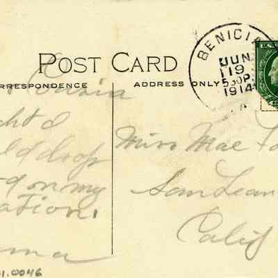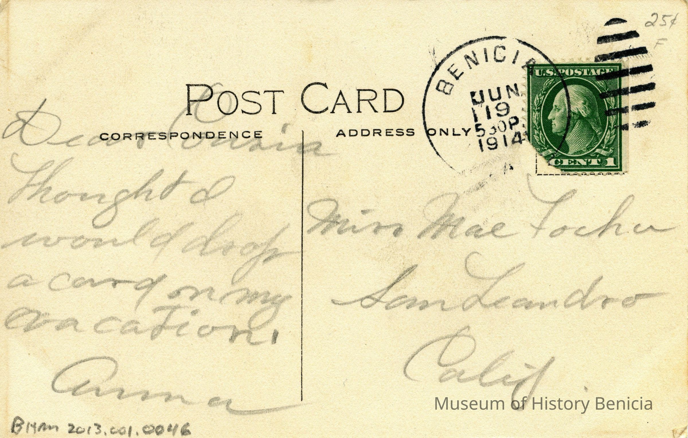 On the back it is addressed to Miss Mae Focher in San Leandro, CA. It says: