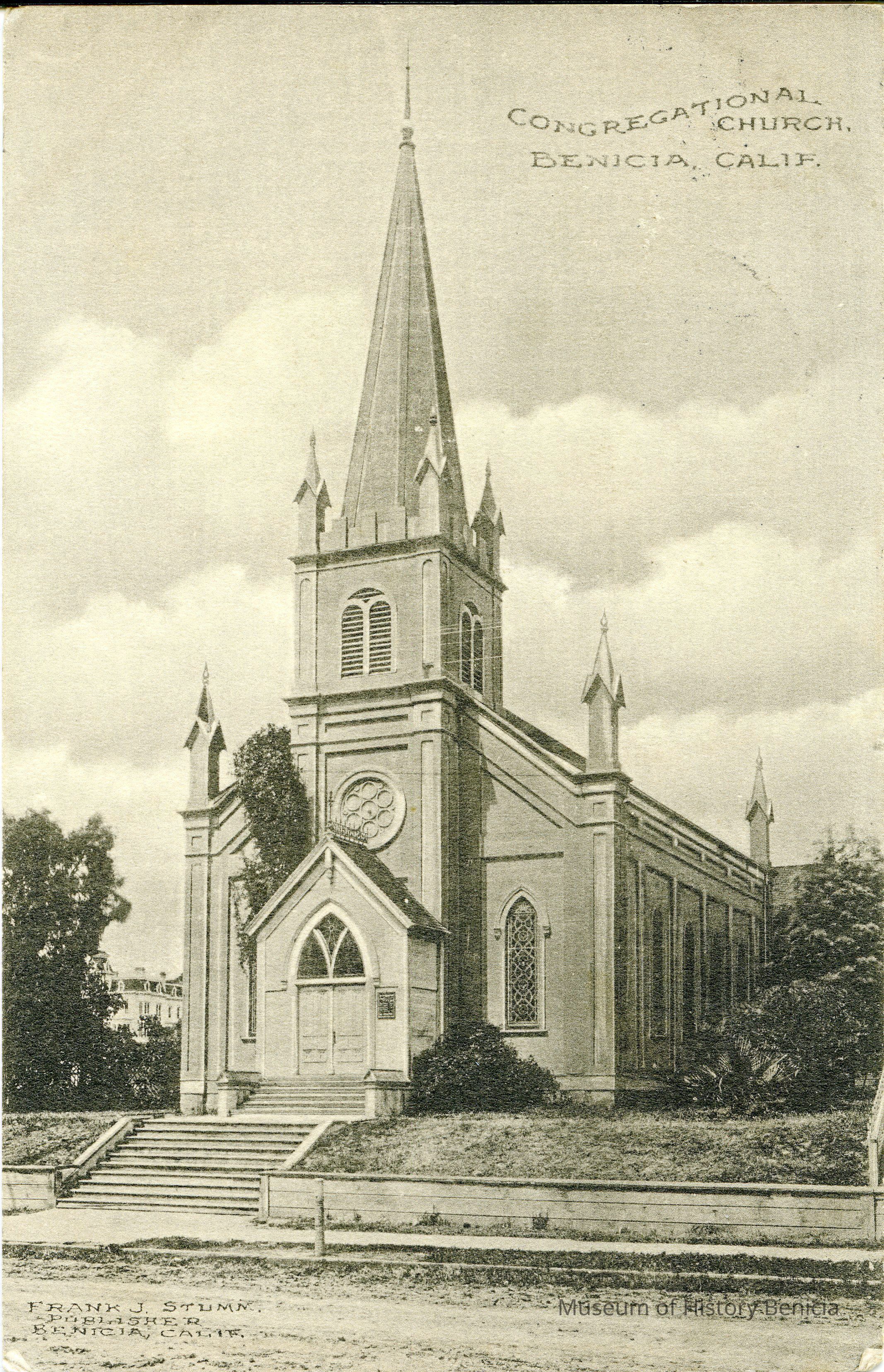 This is a divided back postcard of the "Congregational Church in Benicia, Calif.". The card is black & white with the photo of the Congregational Church in Benicia. It is marked Frank J Stumm Publisher Benicia, Calif.