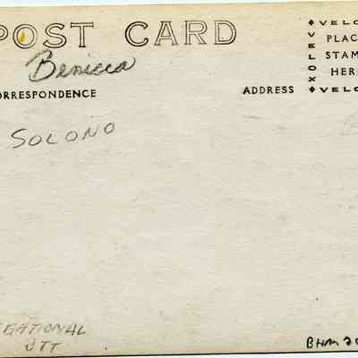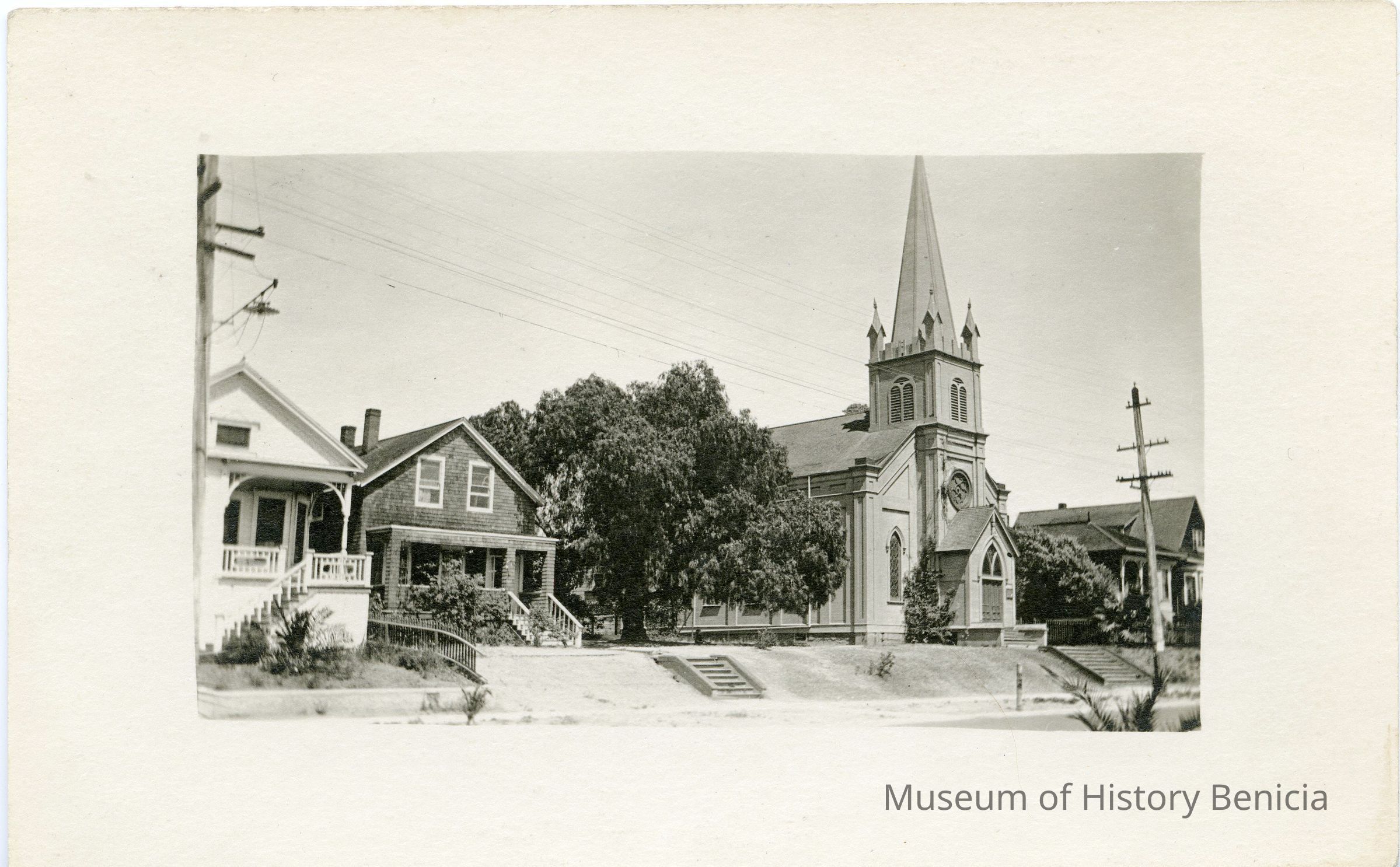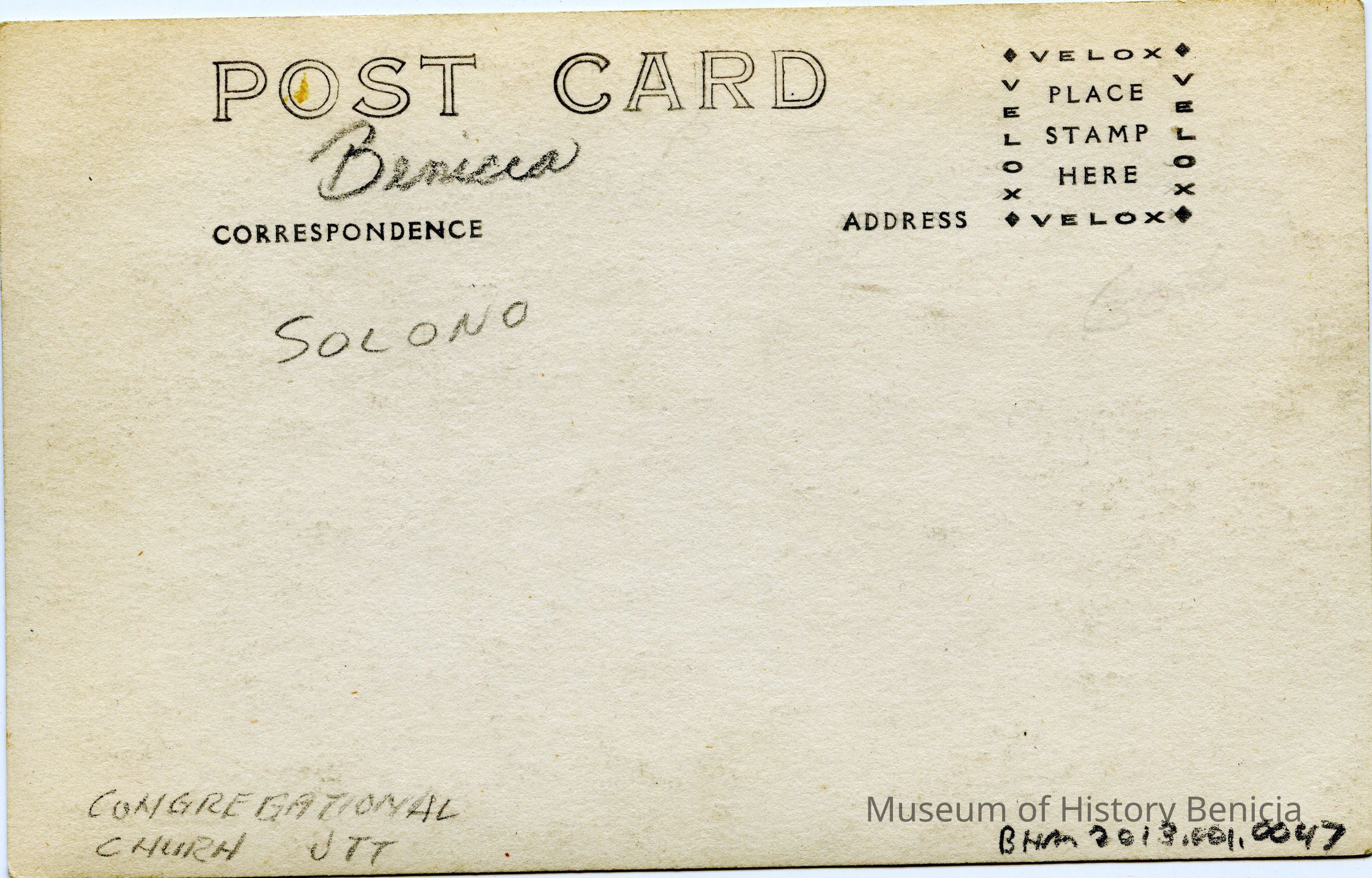This is a divided back postcard of the "Congregational Church in Benicia, Calif.". The card is black & white with a wide white border with the photo of the Congregational Church in Benicia and several nearby houses.
