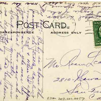 The back is addressed to Mr. Beau Leachman of San Francisco, CA. The message is about the writer's baby and her hirred help.Collection
