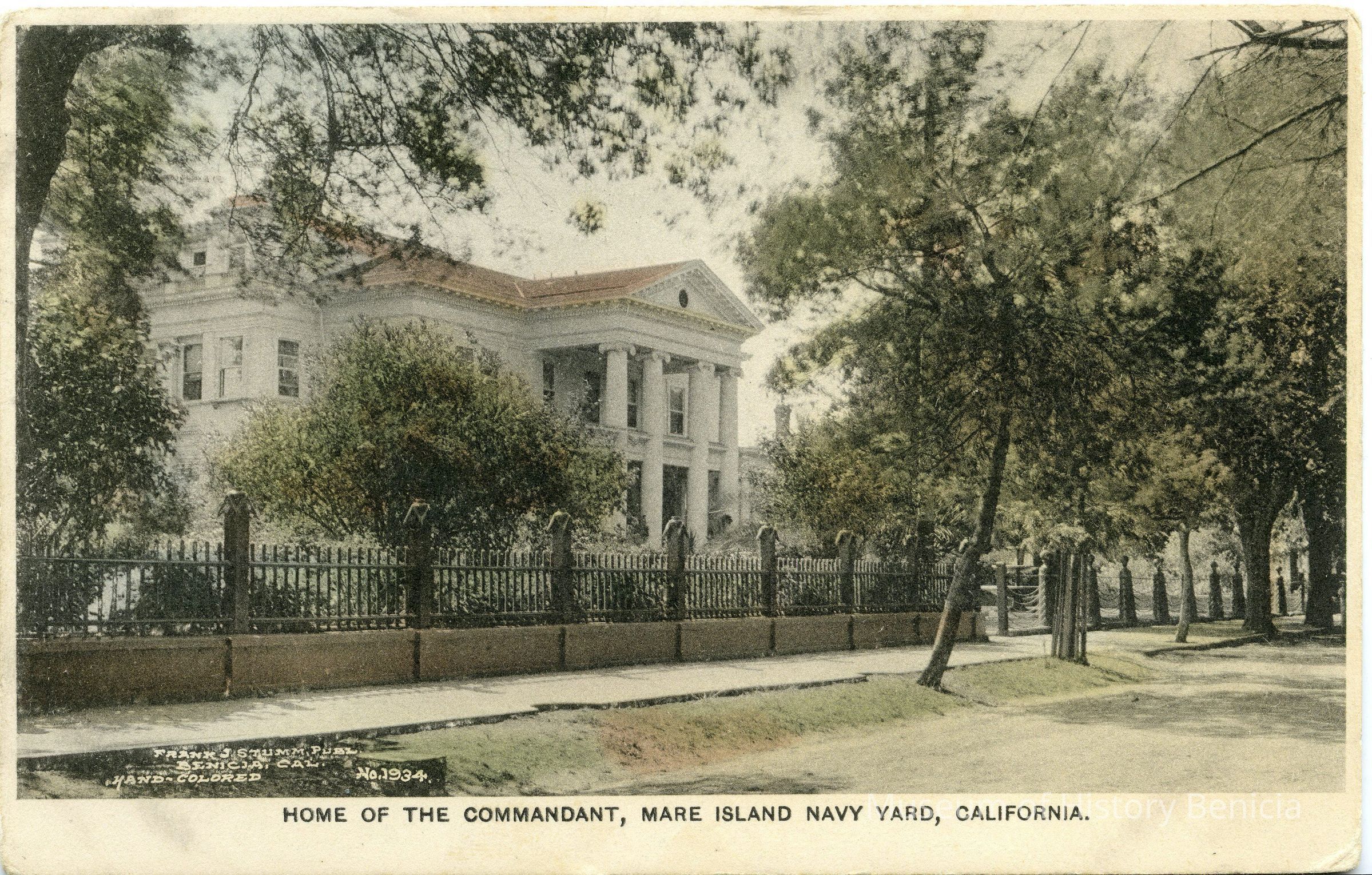 This is a divided back postcard of the Commandant's home on Mare Island, Vallejo. It is marked Frank J Stumm Publisher Benicia, CA. It is a picture of a large home with a wrought iron fence.