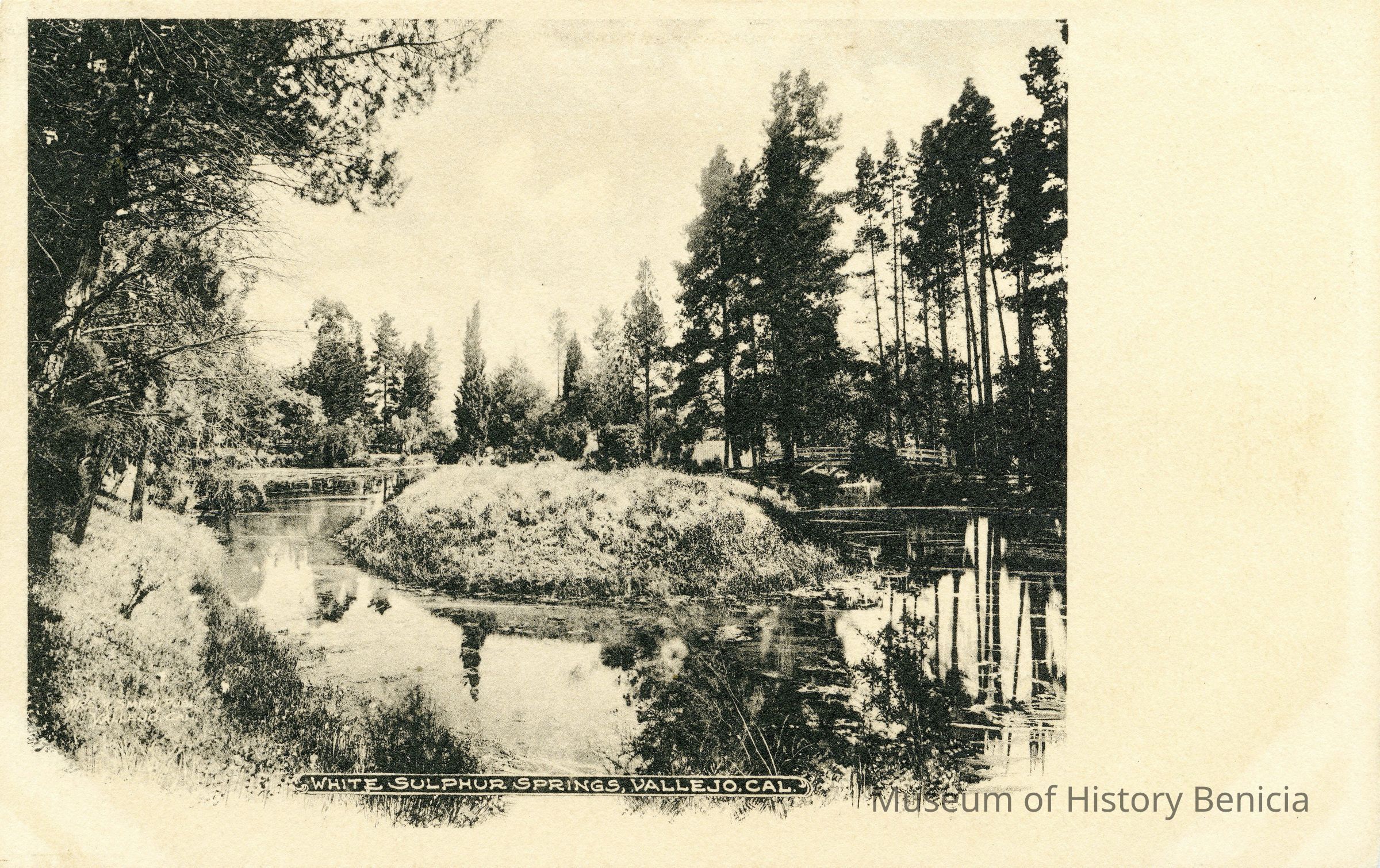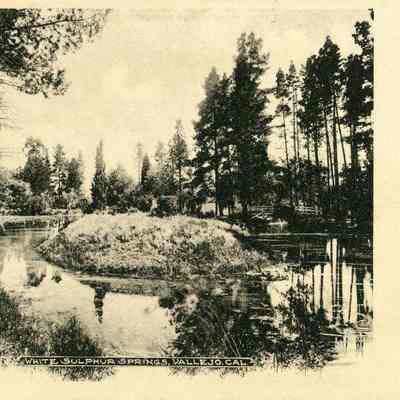 This is an undivided back postcard of White Sulfur Springs in Vallejo. It is blank on the back. The publisher is Mrs. M. Smith of Vallejo. The card shows an island in the lake at the resort.Collection