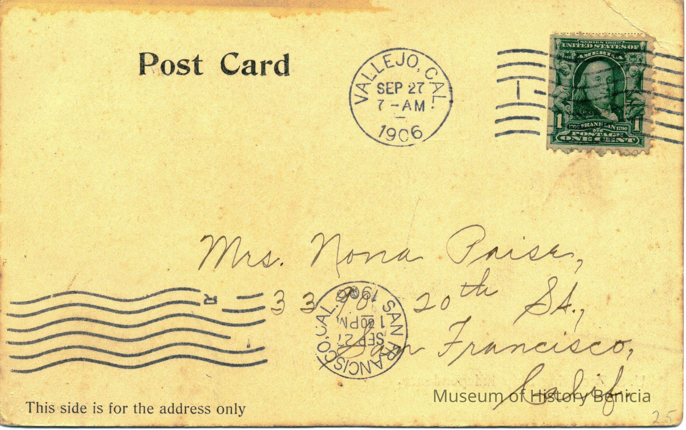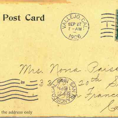 The message on the front says "How is the youngest? Bon" The back is addressed to Mrs. Nona Paisa of San Francisco.Collection