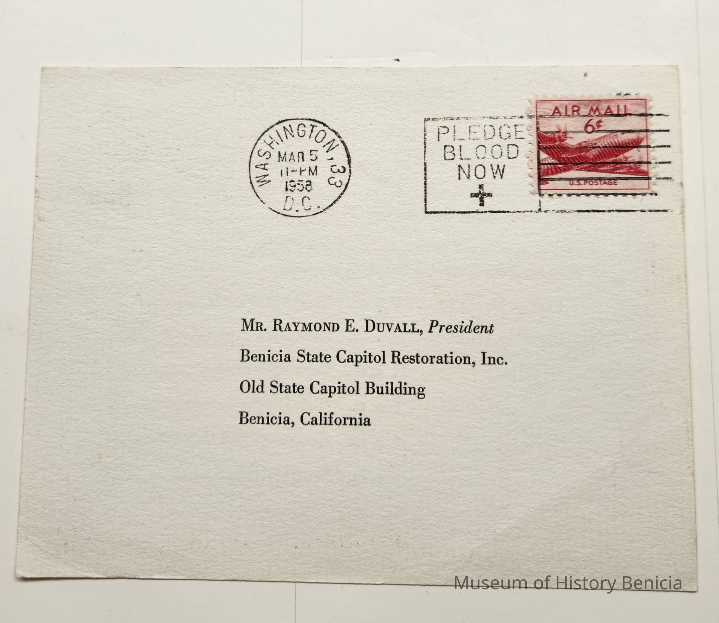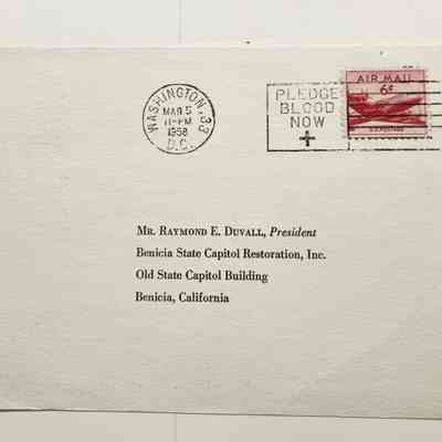 Address side: Mr. Raymond E Duvall, President / Benicia State Capitol Restoration, Inc. / Old State Capitol Building / Benicia, California; Postmarked Washington 33 DC; Mar 5 11PM 1958 with a 6 cents Air Mail U.S. Postage StampCollection