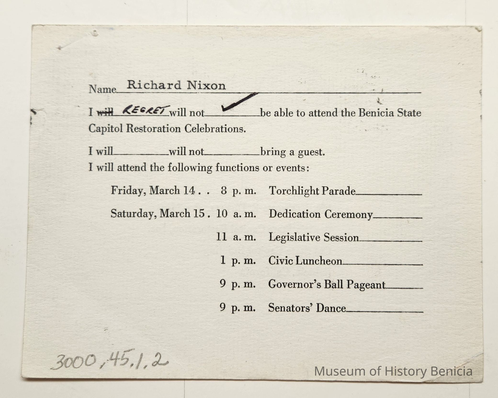 Message side: Name: Richard Nixon replied "I regret will not be able to attend Benicia State Capitol Restoration Celebration" with a check mark.