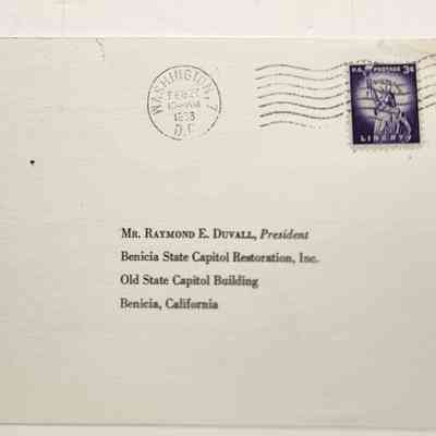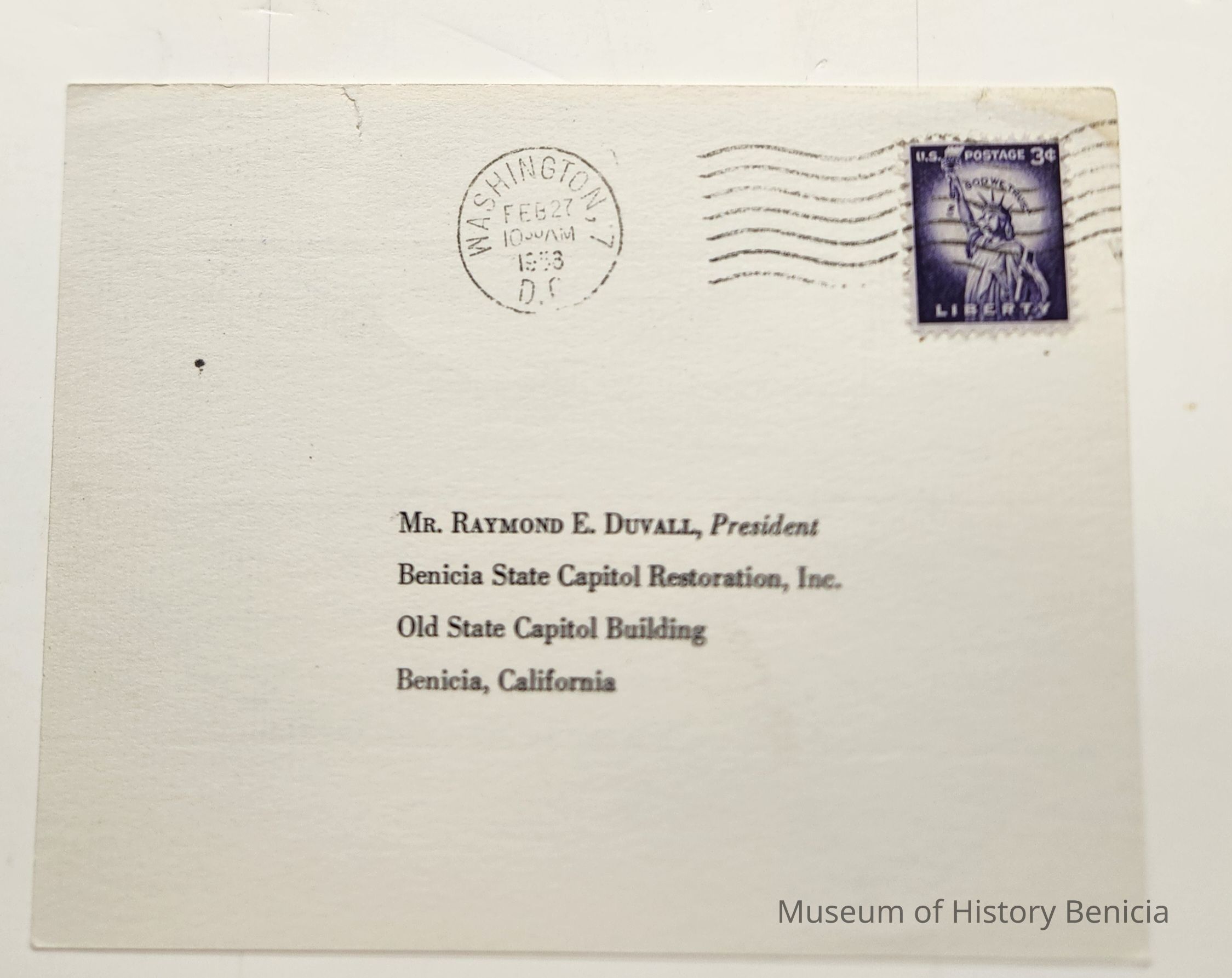 Address side: Mr. Raymond E. Duvall, President / Benicia State Capitol Restoration, Inc. / Old State Capitol Building / Benicia, California; Postmarked Washington 7 DC Feb 27, 10:00 am 1958; with a three cents U.S. Postage Stamp.Collection
