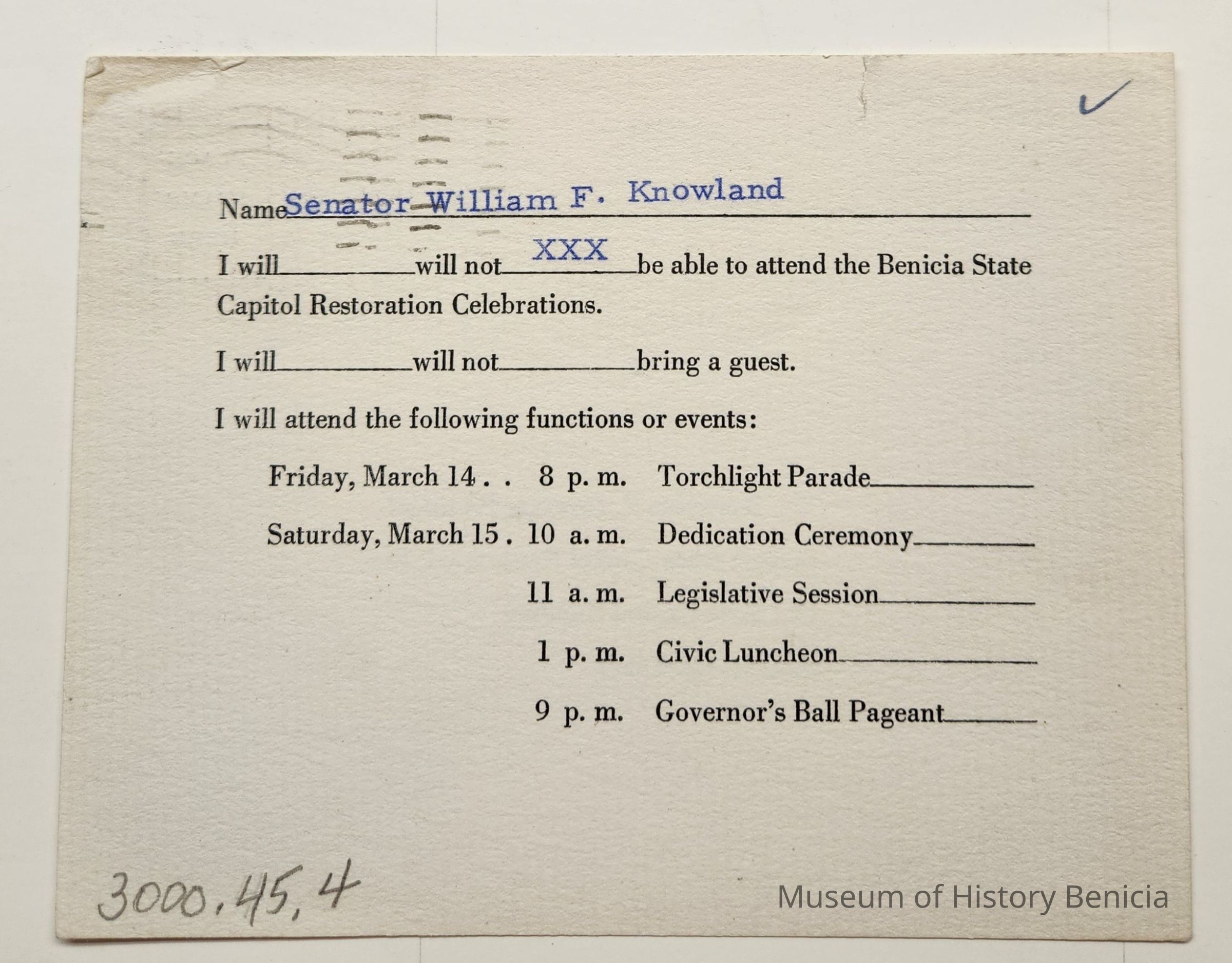 Message side: Name: Senator William F. Knowland (typed in blue ink) replied with three typed capital X's would not attend
