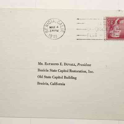Address side: Mr. Raymond E. Duvall, President / Benicia State Capitol Restoration, Inc. / Old State Capitol Building / Benicia, California; Postmarked Benicia, Calif March 4 3:30p.m. 1958 upside down two cents U.S. Postage StampCollection