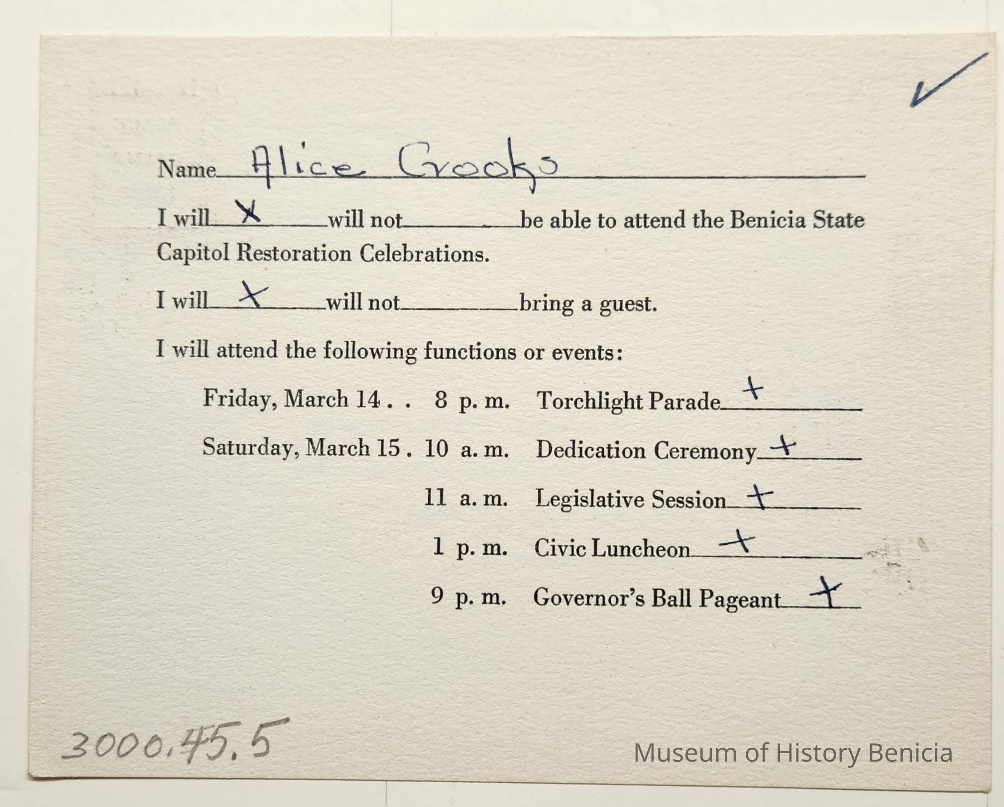 Message side: Name: Alice Crooks (written in blue ink) replied would be attending all events with x's.