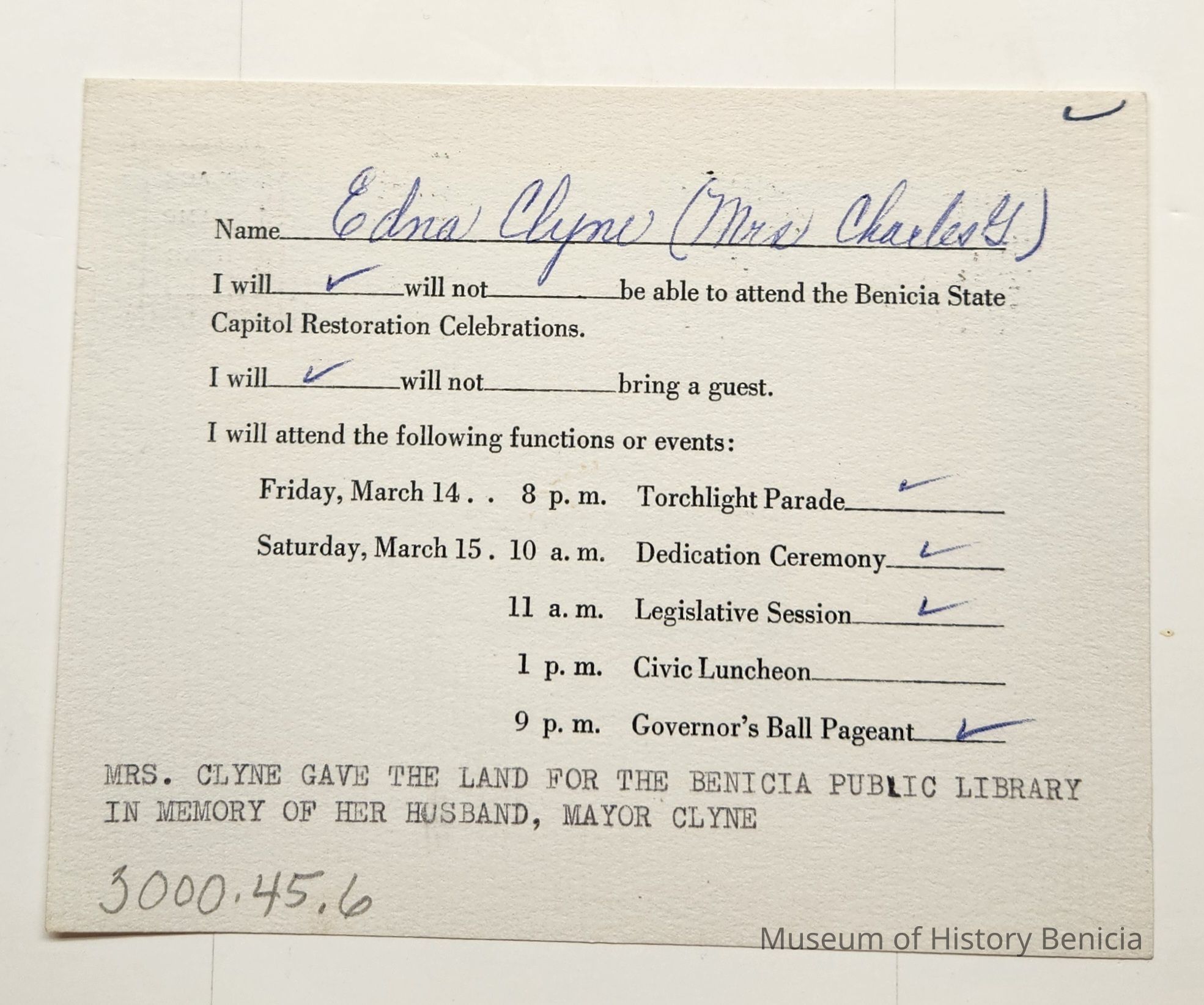 Message side: Name: Edna Clyne (Mrs. Charles G.) written in blue ink, replied would attend all events except the Civic Luncheon; typed at the bottom: "Mrs. Clyne gave the land for the Benicia Public Library in Memory of her husband, Mayor Clyne"