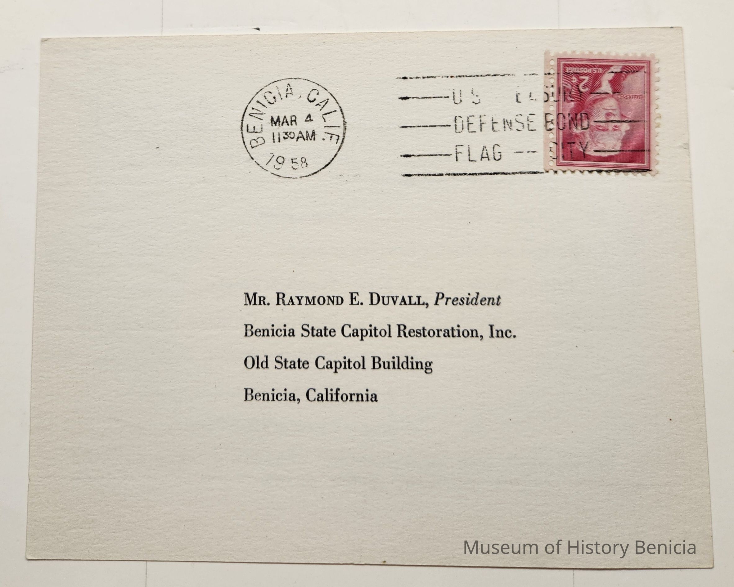 Address side: Mr. Raymond E. Duvall, President / Benicia State Capitol Restoration, Inc. / Old State Capitol Building / Benicia, California; Postmarked Benicia, Calif Mar 4 11:30 a.m. 1958; upside down two cents U.S. Postage StampCollection