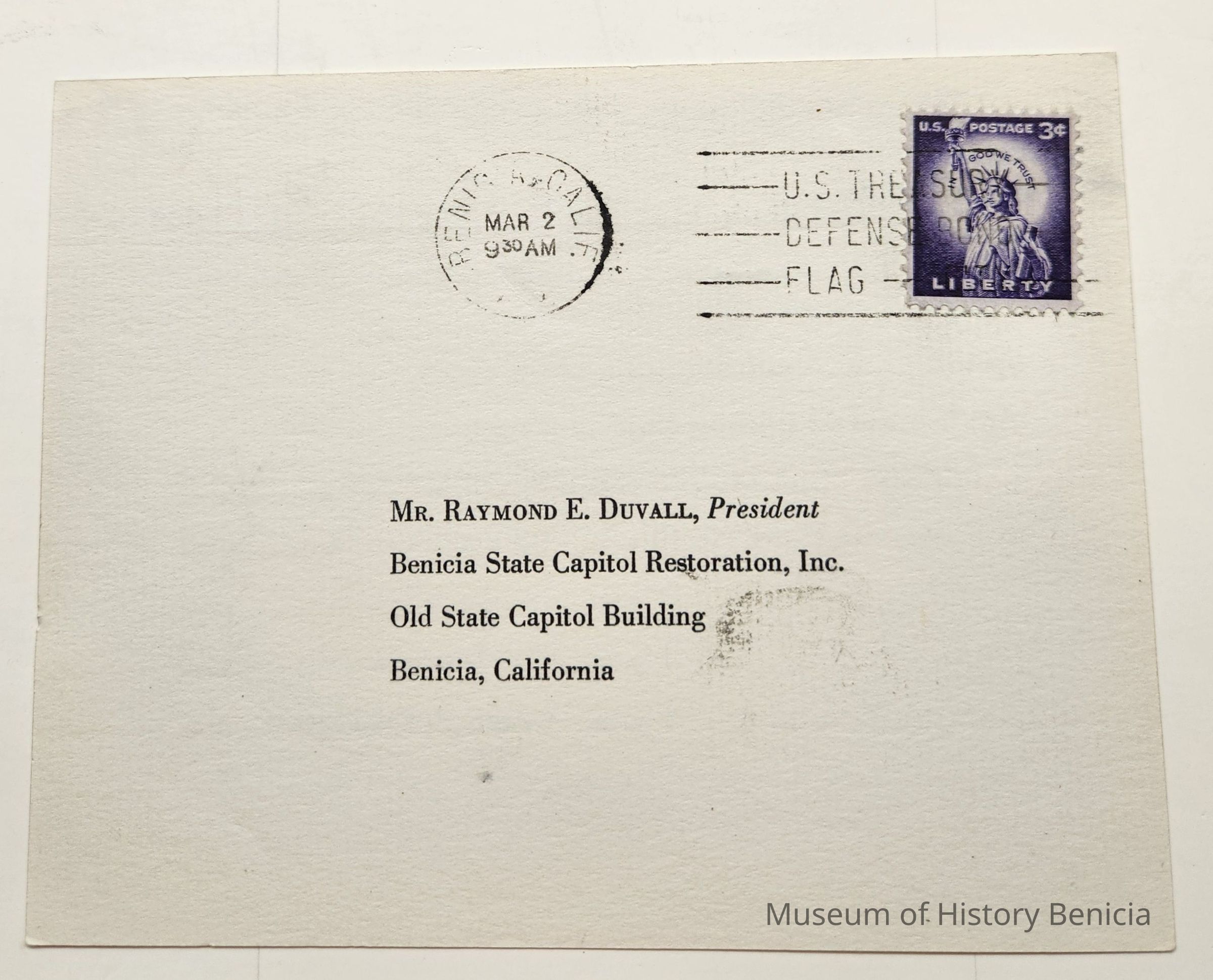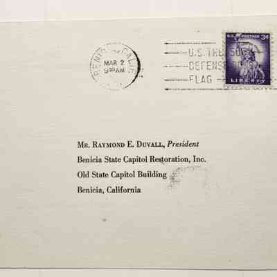 Address side: Mr. Raymond E. Duvall, President / Benicia State Capitol Restoration, Inc. / Old State Capitol Building / Benicia, California; Postmarked Benicia, Calif. Mar 2 9:30 a.m. 1958 with three cents U.S. Postage Stamp.Collection