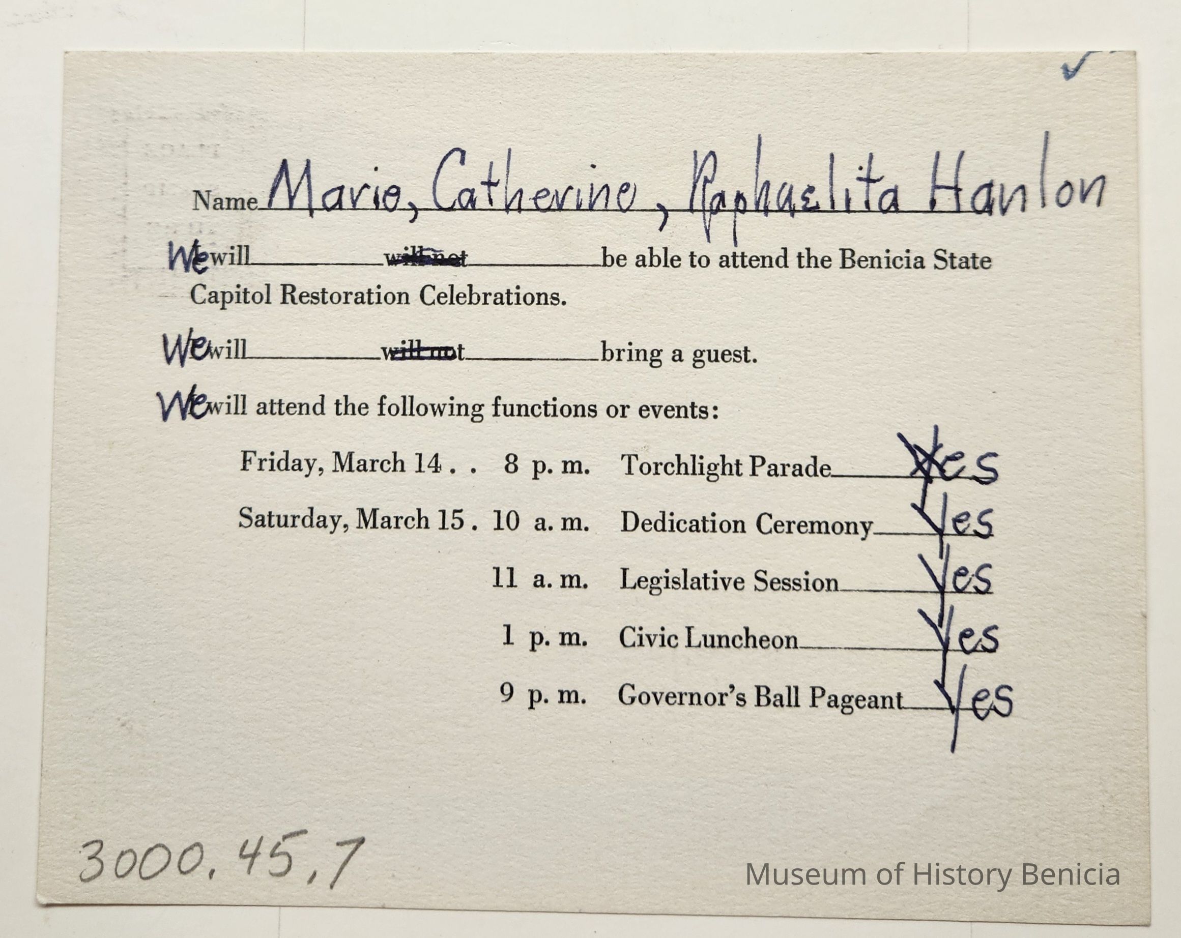 Message side: Marie, Catherine, Raphaelita Hanlon replied they would all attend all events marked in black ink written "we" and "yes"