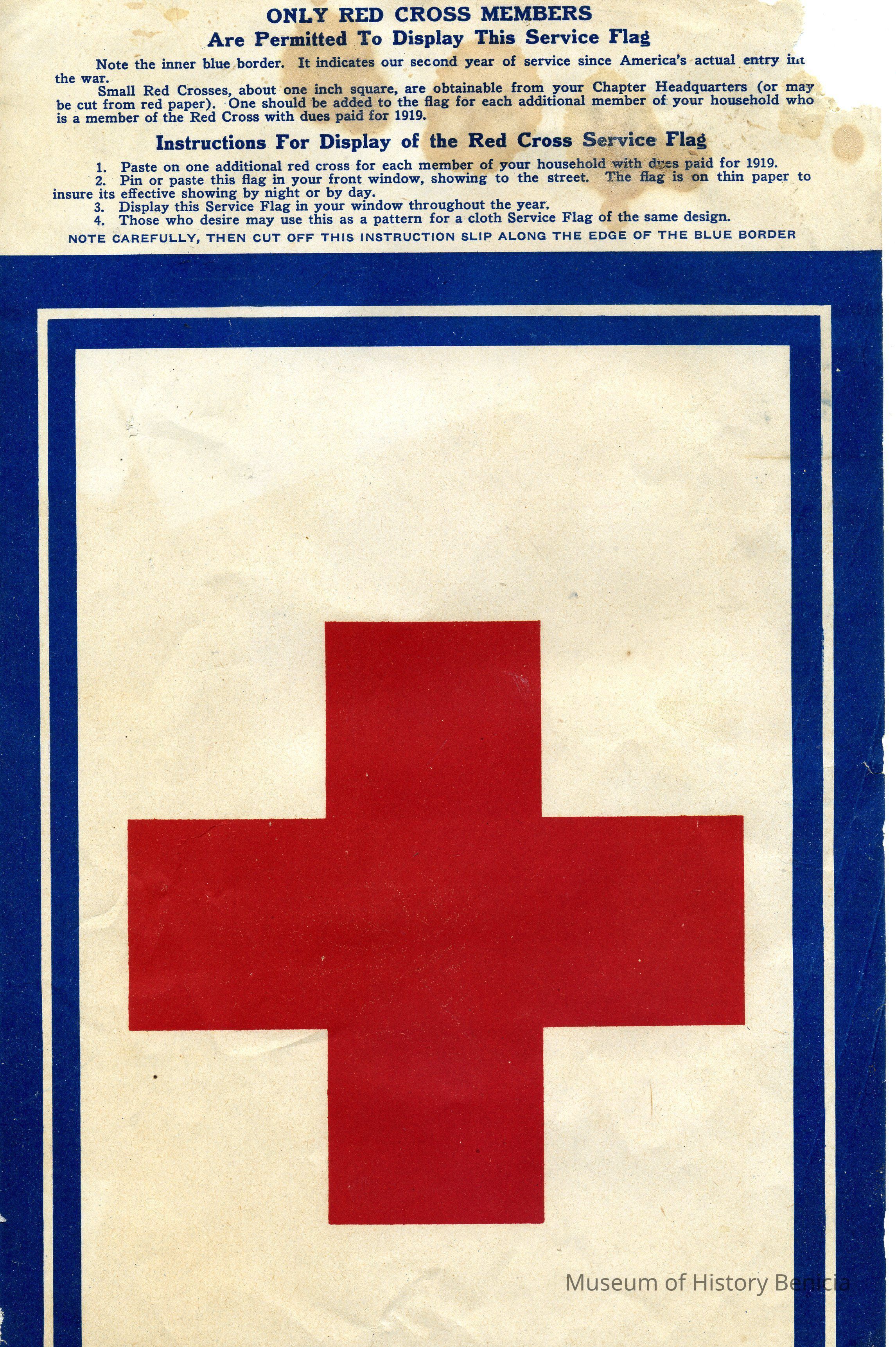 "Only Red Cross Members / Are permitted to Display This Service Flag" Instructions for display are also listed with the note that the instructions should be cut off before displaying.