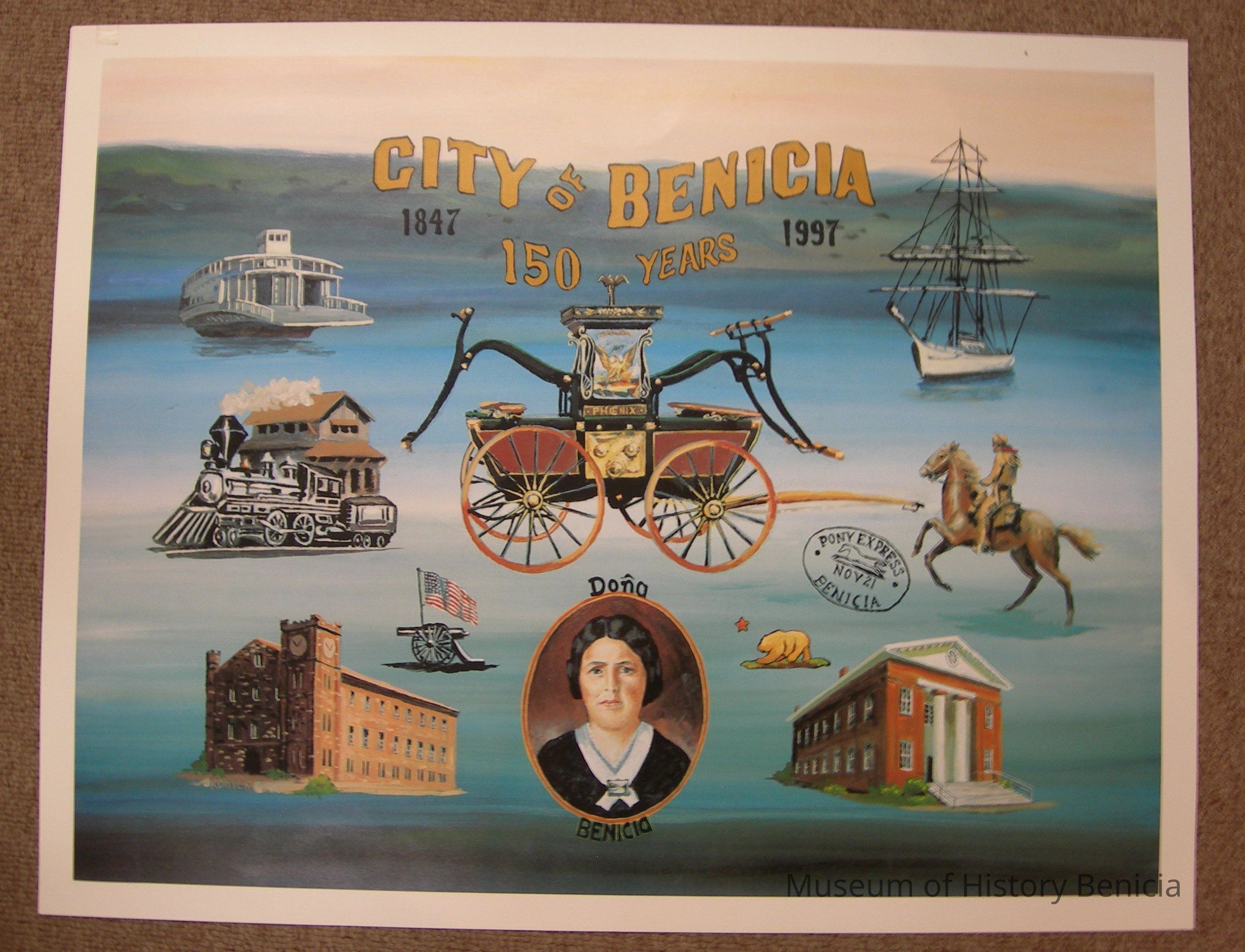 Poster of painting by Wayne Kohler: "City of Benicia / 1847 - 1997 / 150 Years" Collection of drawings representing Benicia History: ferry boat, sailing ship, train & depot, Phoenix fire pumper, Pony Express rider & stamp, clock tower, cannon & flag, Dona Benicia portrait, bear & star (from state flag) and capitol building; all on blue and green background (representing straits and hills and sky)