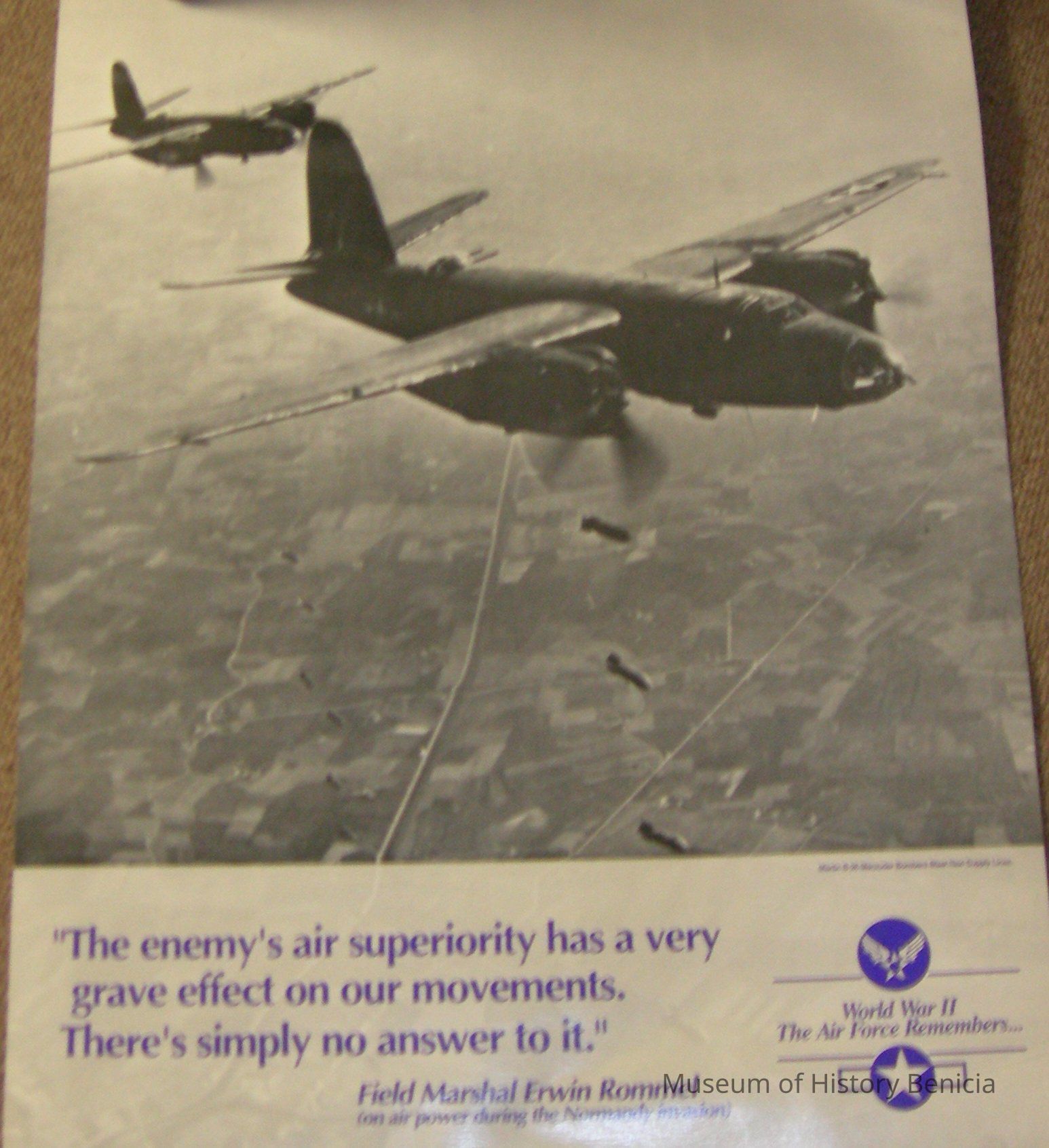 B/W photo of "Martin B-26 Marauder Bombers Blast Nazi Supply Lines". Grey strip at bottom printed in blue: "The ememy's air supperiority has a very grave effect on our movements. There's simply no answer to it." Field Marshall Erwin Rommel (on air power during the Normandy invasion)