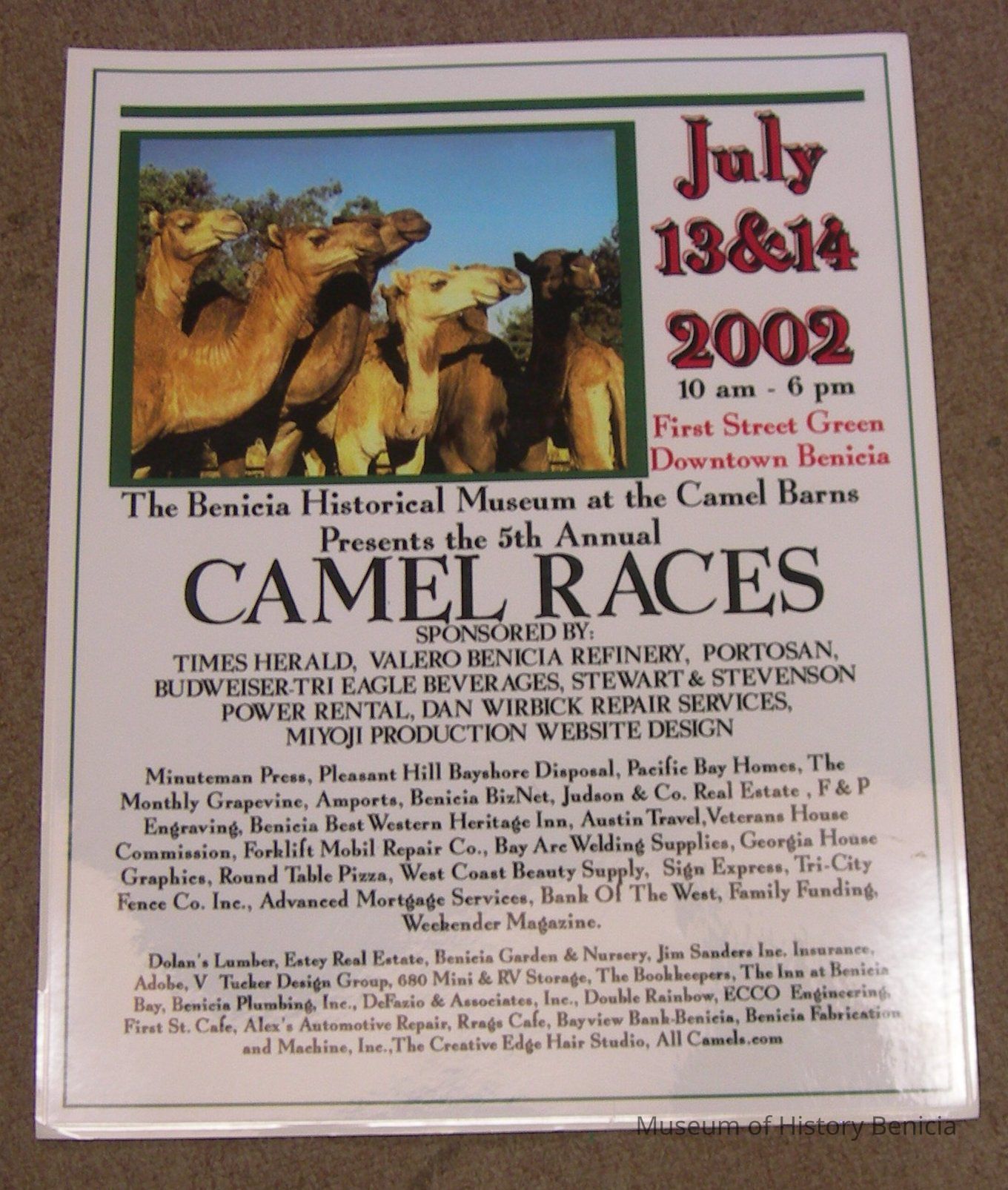 Color photograph of camels at top left; black lettering except for the date and location which are in red ,on white background.
