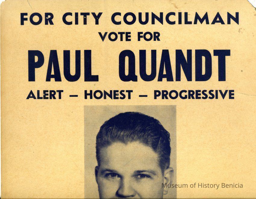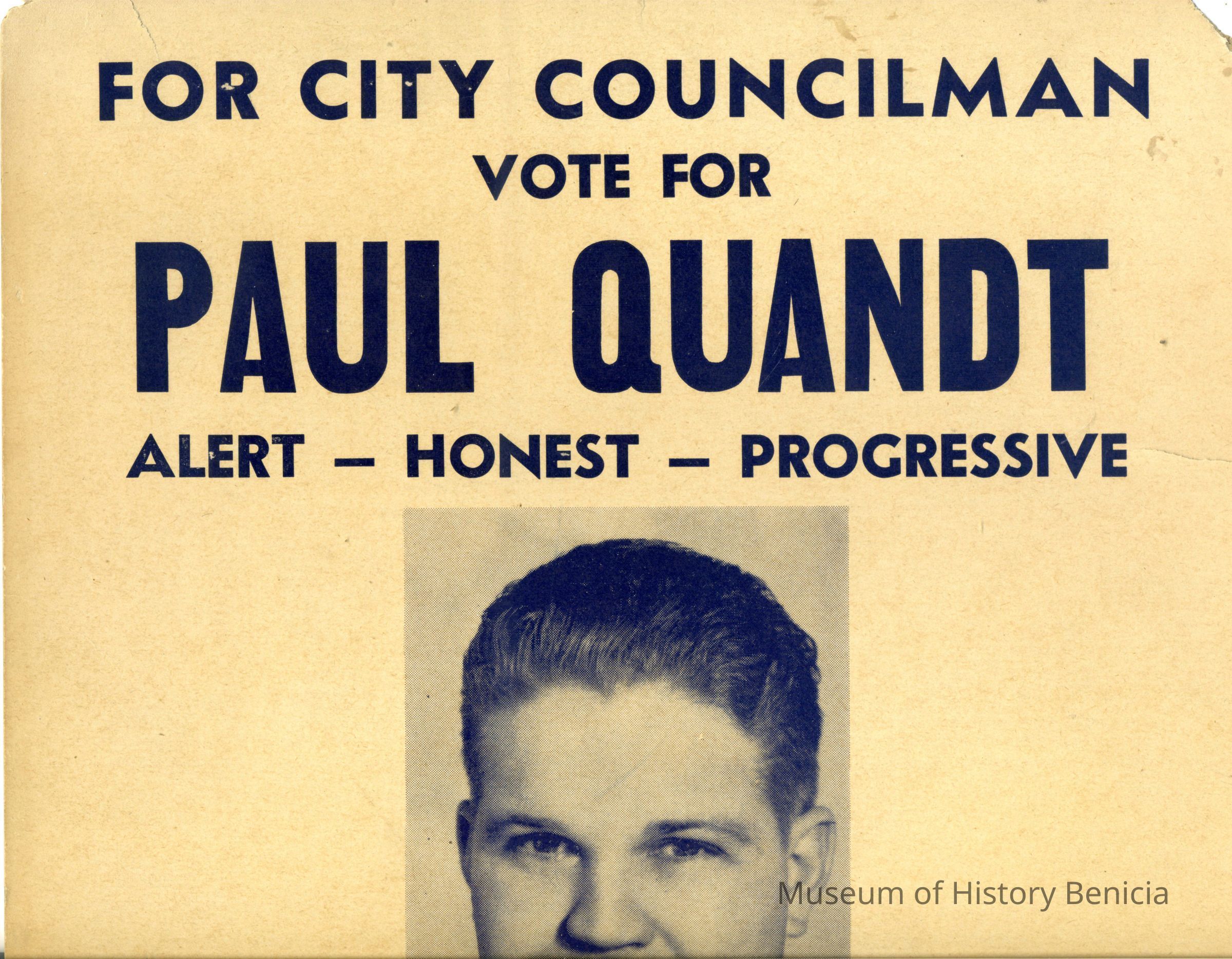 This is a political poster for Paul Quandt running for City Councilman. This is probably in Benicia and about 1948 based on other posters found with this one.Collection