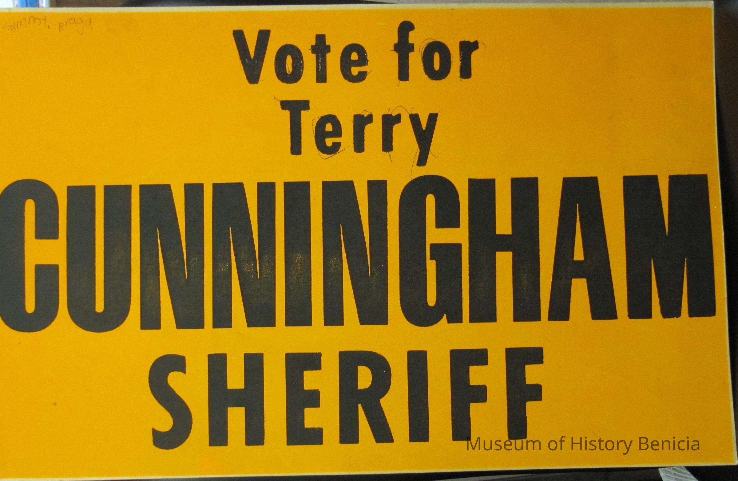 "Vote for Terry Cunningham for Sheriff" Orange background and blck lettering. Tape on Poster.