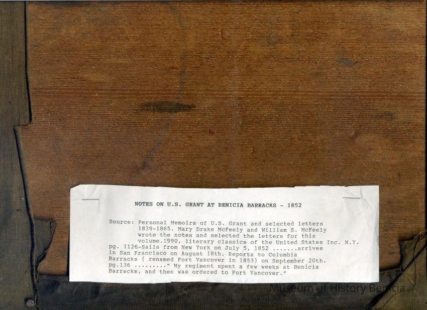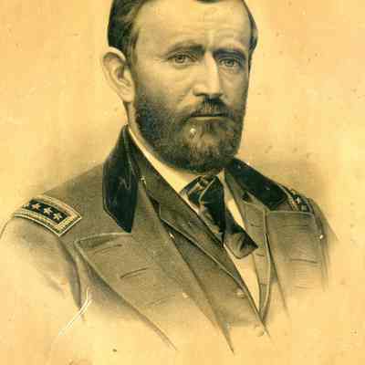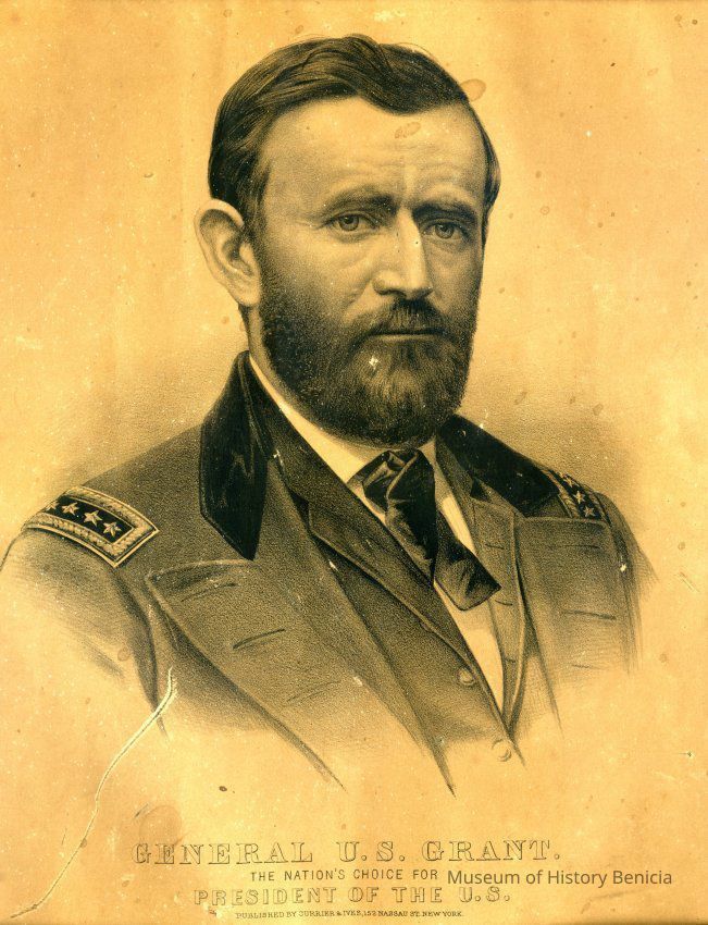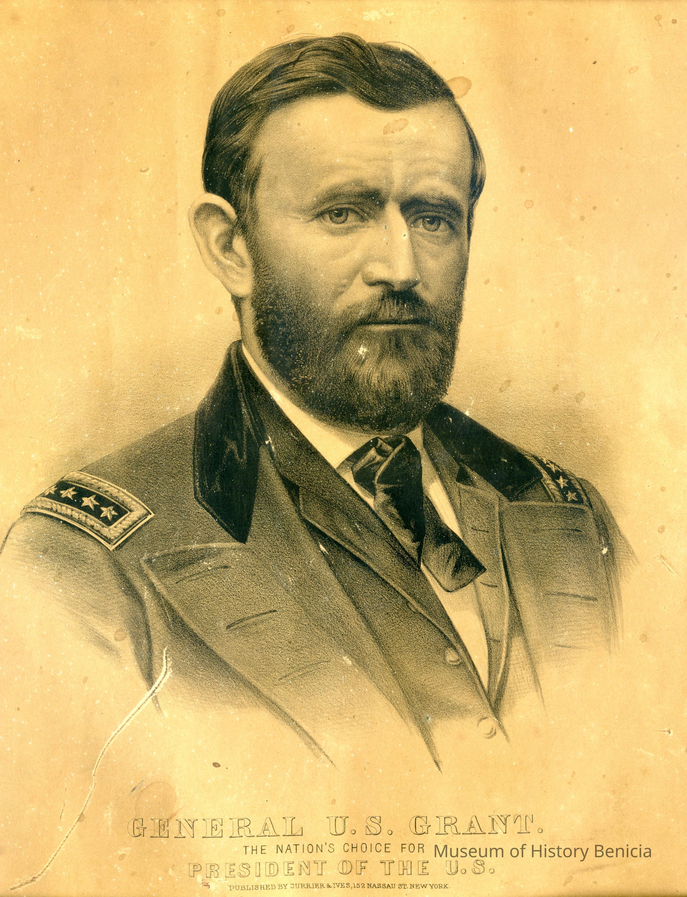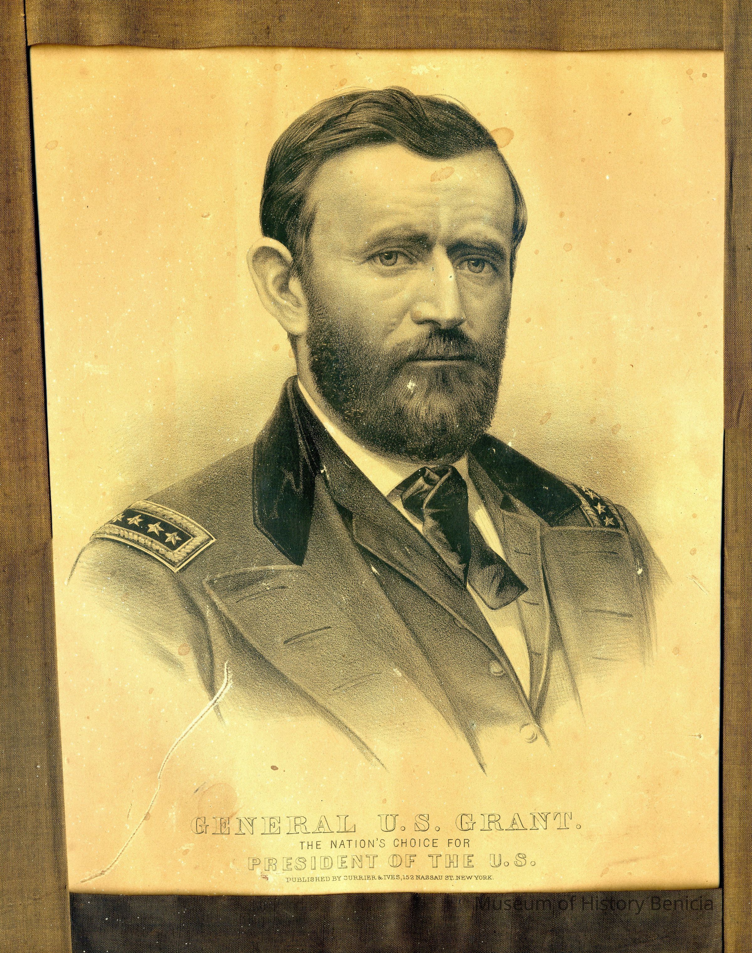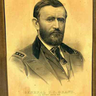 Lithograph campaign poster of U.S. Grant when he ran for president in 1868. The poster is mounted on a rough board with faded brown cloth borders