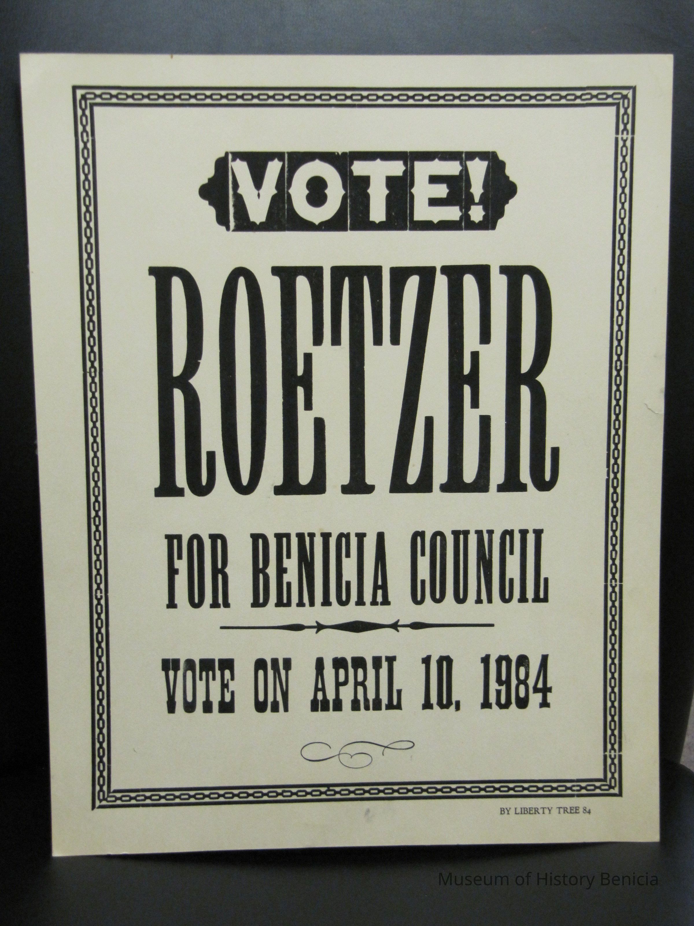Political Poster for "Vote! Roetzer for Benicia Council Vote on April 10, 1984. White with black.