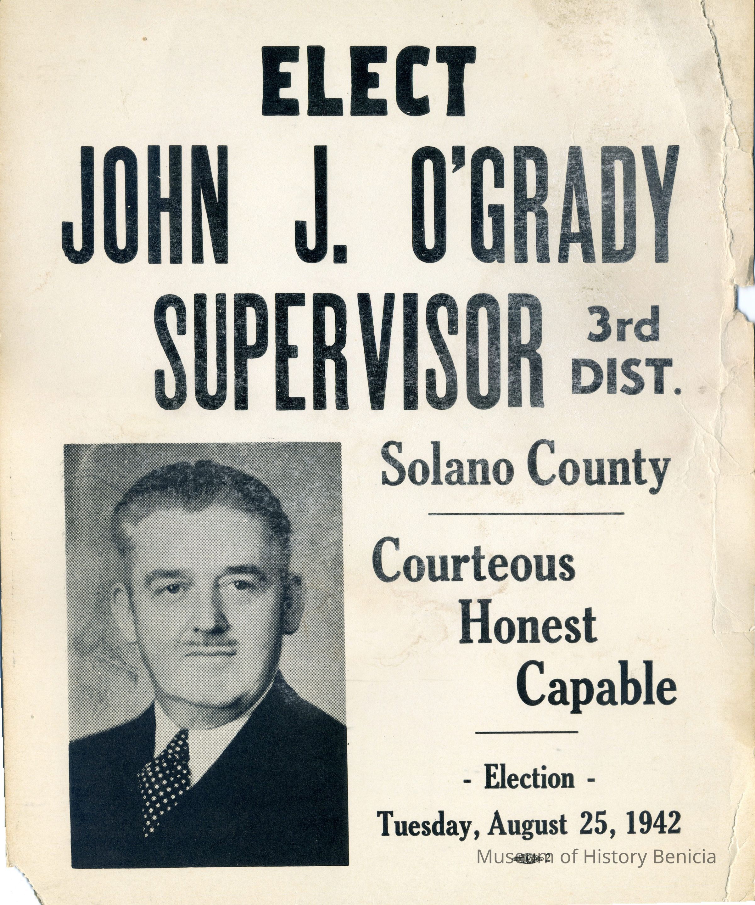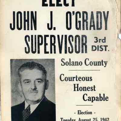 Political poster to elect John J O'Grady to 3rd Dist County Supervisor position. Dated 08/25/1942