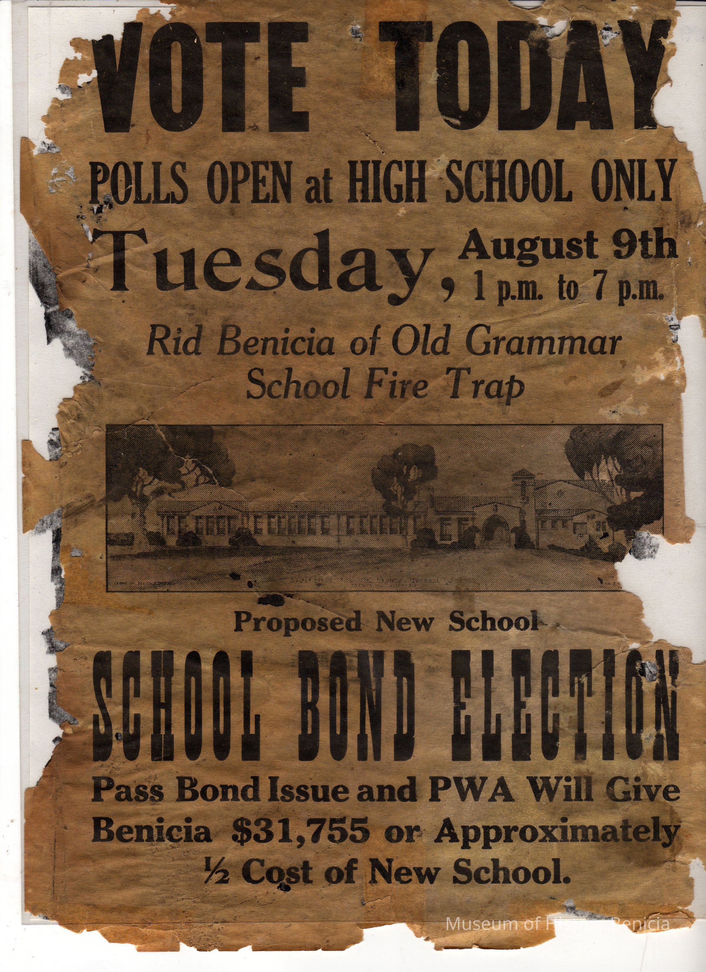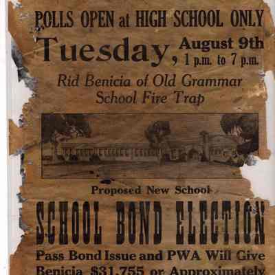 Poster announcing the school board Election to build a new high school at 250 East L Street. August 9th fell on a Tuesday in 1932, 1927, and 1921. These are all years close to when the Old Grammar school was demolished in 1938.Collection