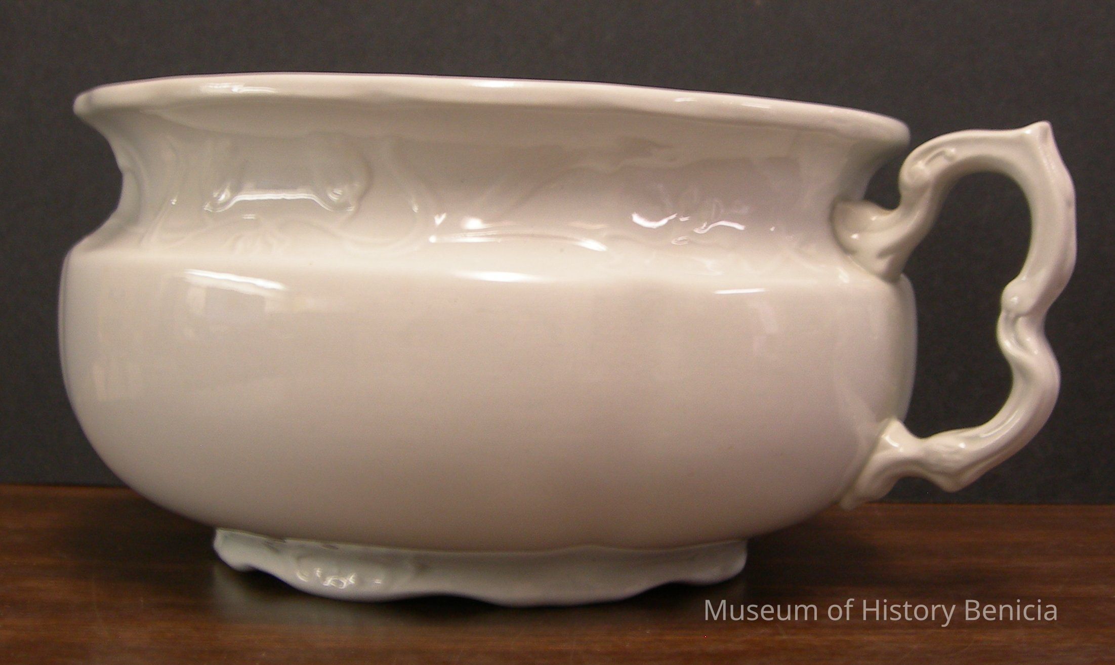White, ironstone china chamber pot with a handle on one side;