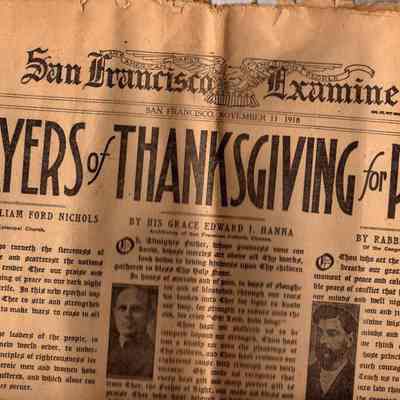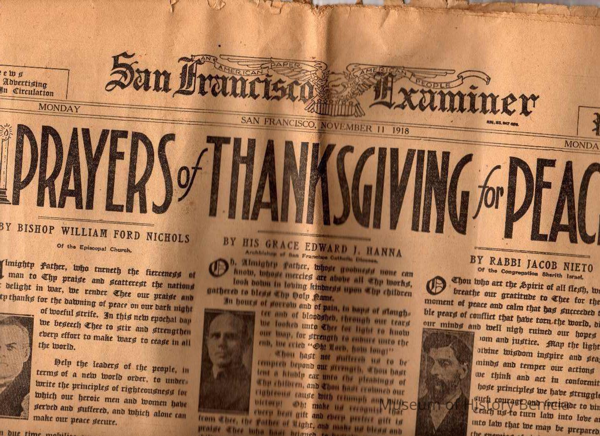 San Francisco Examiner dated November 11, 1918 with pages 6-9. Front page articles include: Prayers of Thanksgiving for Peace, Ally Triumph Portrayed in Park Pageant, Parents Lose Baby Girl in "Flu" Attack.Collection