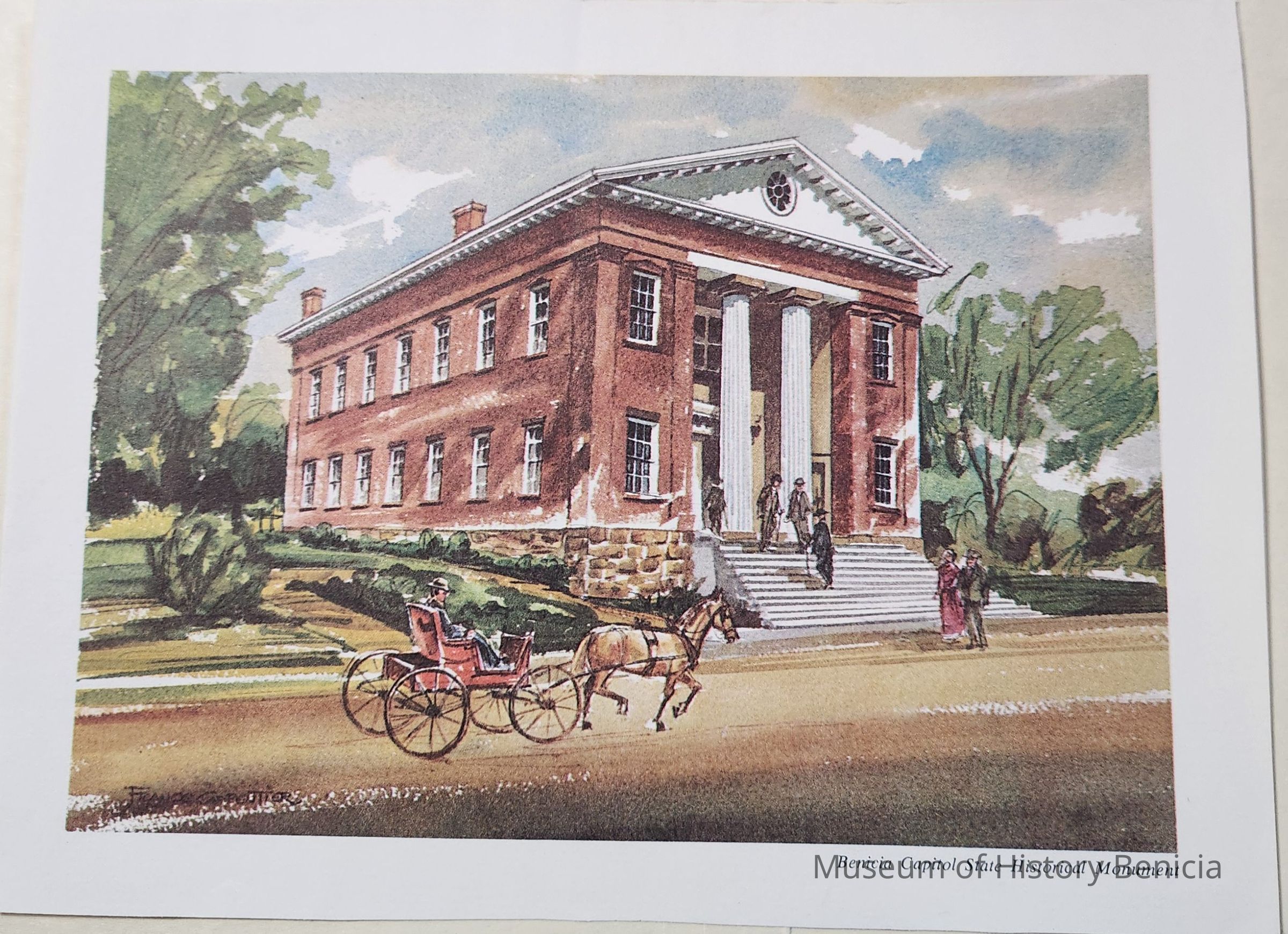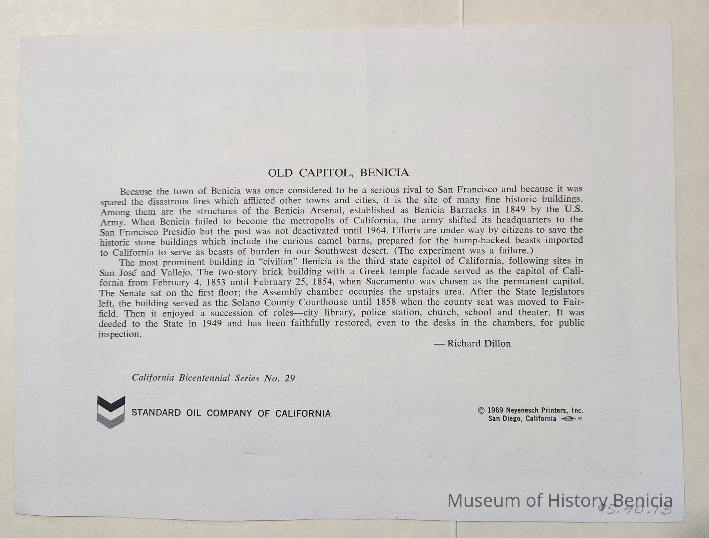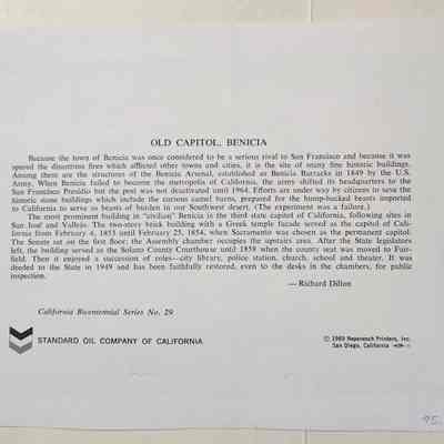 On the front is a reproduction of a water color painting depicting the Benicia State Capitol building about the time it was built. Caption: "Benicia Capitol State Historical Monument". On the back is information/history of the "Old Capitol, Benicia". The two paragraphs were written by Richard Dillon. At the bottom: California Bicentennial Series No. 29 / Standard Oil Company of California / copyright 1969 Neyenesch Printers, Inc. / San Diego, CaliforniaCollection