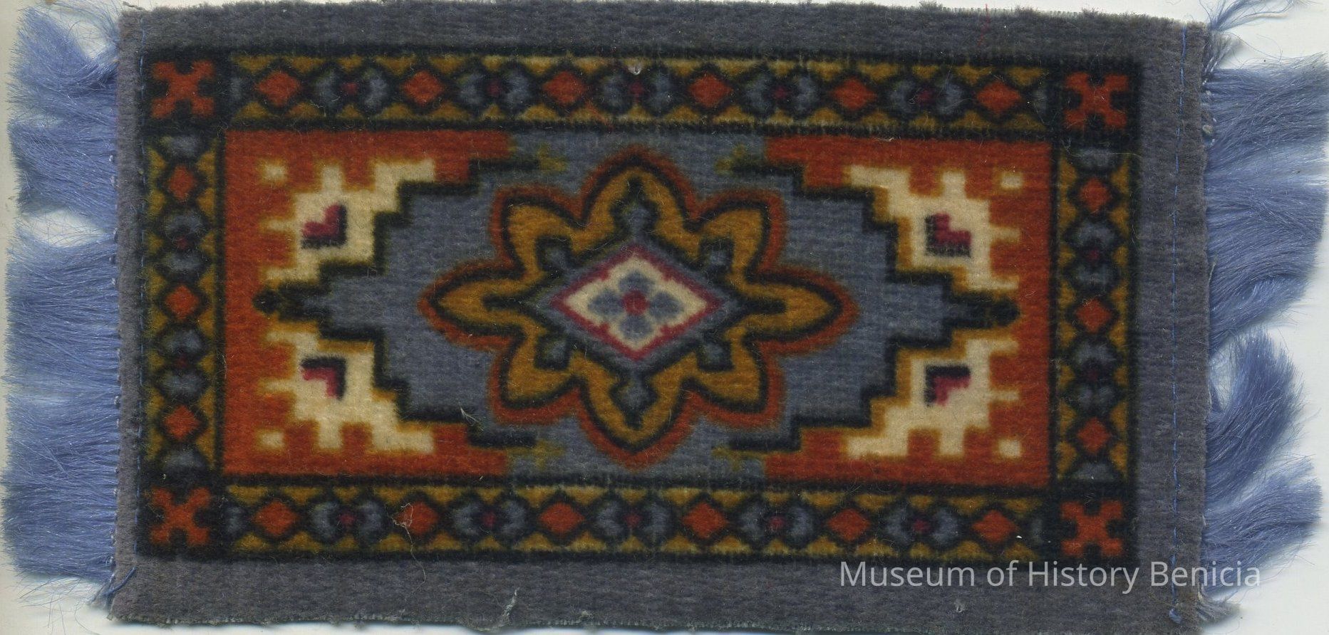 Small rug-like piece, fuzzy on one side with fringe on two short ends. Gray-blue with center flower-like patterns in orange, gold, white, and blue. Stamped on back: "Factory No. 30 2nd Dist. N.Y."