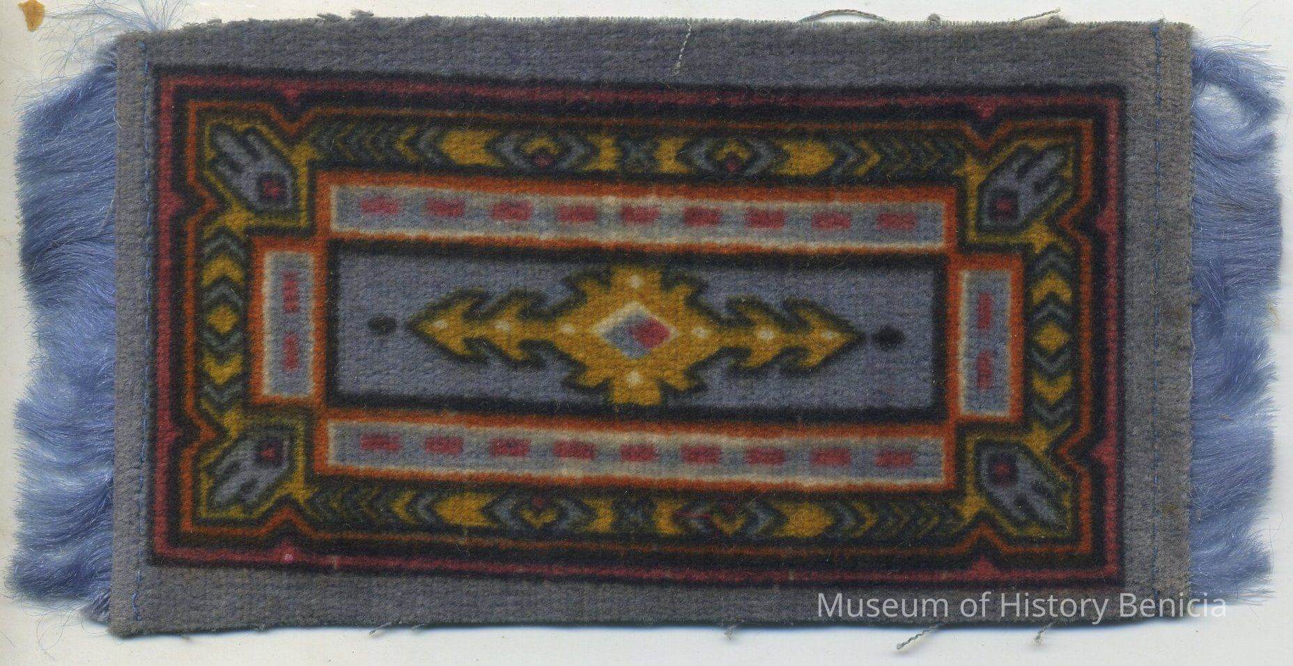 Small rug-like piece, fuzzy on one side with fringe on two short ends. Medium blue with geometric patterns in red, gold, white, blue and black. Stamped on back: "Factory No. 30 2nd Dist. N.Y."